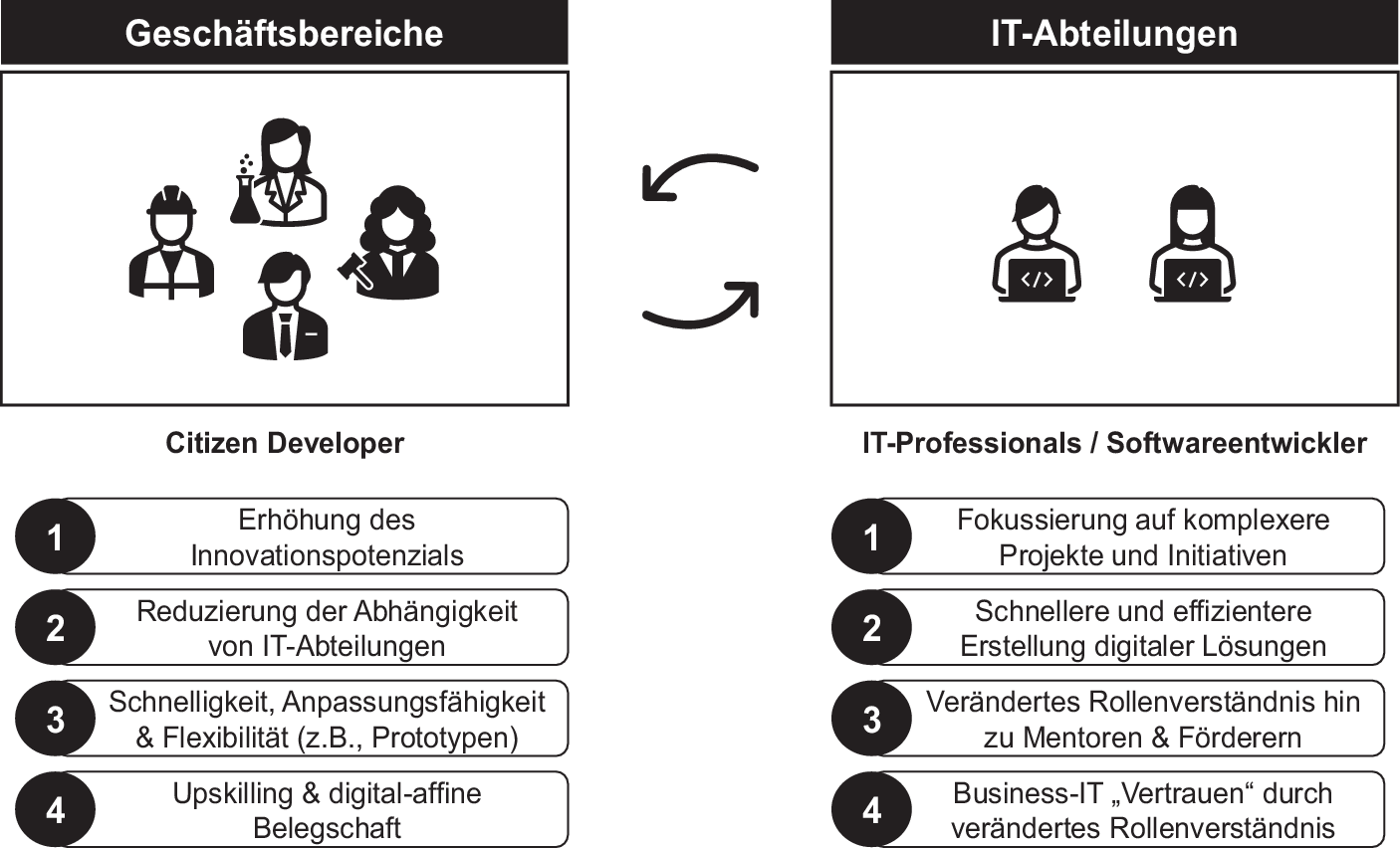 Low-Code-Entwicklungsplattformen bieten das Potenzial tiefgreifende Auswirkungen auf die Unternehmenskultur zu haben, indem sie neue Möglichkeiten bieten Geschäftsinnovationen voranzutreiben und die Zusammenarbeit zwischen IT-Abteilungen und Geschäftseinheiten zu verbessern. Im Folgenden beschreiben wir diese Potenziale und die Chancen, die sich für Unternehmen ergeben. Wie in Abb. 1 zu sehen, können sowohl Geschäftsbereiche (das „Business“) als auch IT-Abteilungen (die „IT“) von Low-Code-Plattformen profitieren.