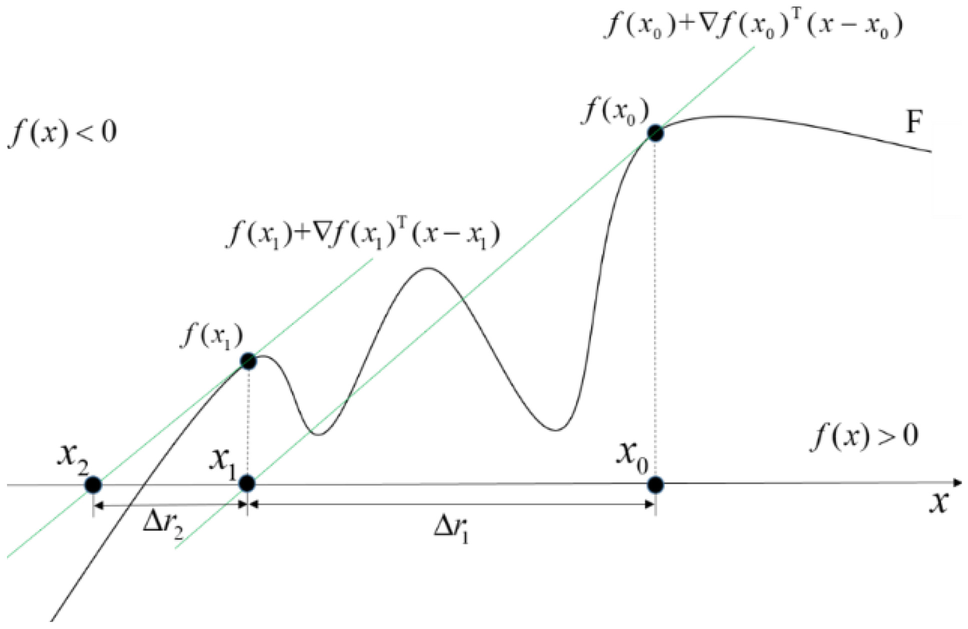 For a nonlinear decision function \(f\), as shown in Fig. 2, we first consider the case where the dimension of input space is \(n = 1\). We then use the iterative approach to approximate the optimal solution. In the first iteration when the input is \(x_{0}\), the green line represents the first-order Taylor expansion tangent, i.e., \(f(x_{0} ){ + }\nabla f(x_{0} )^{\rm T} (x - x_{0} )\), and the intersection of the tangent line and the input data set \({\mathbf{\mathbb{R}}}^{1}\) is \(x_{1}\), at which time the distance of the input data \(x_{0}\) from \(x_{1}\) is \(r_{1}\), which is the perturbation of the first iteration. The iteration stops when the input data sample is on the other side of the decision function. The minimum perturbation obtained at this point is