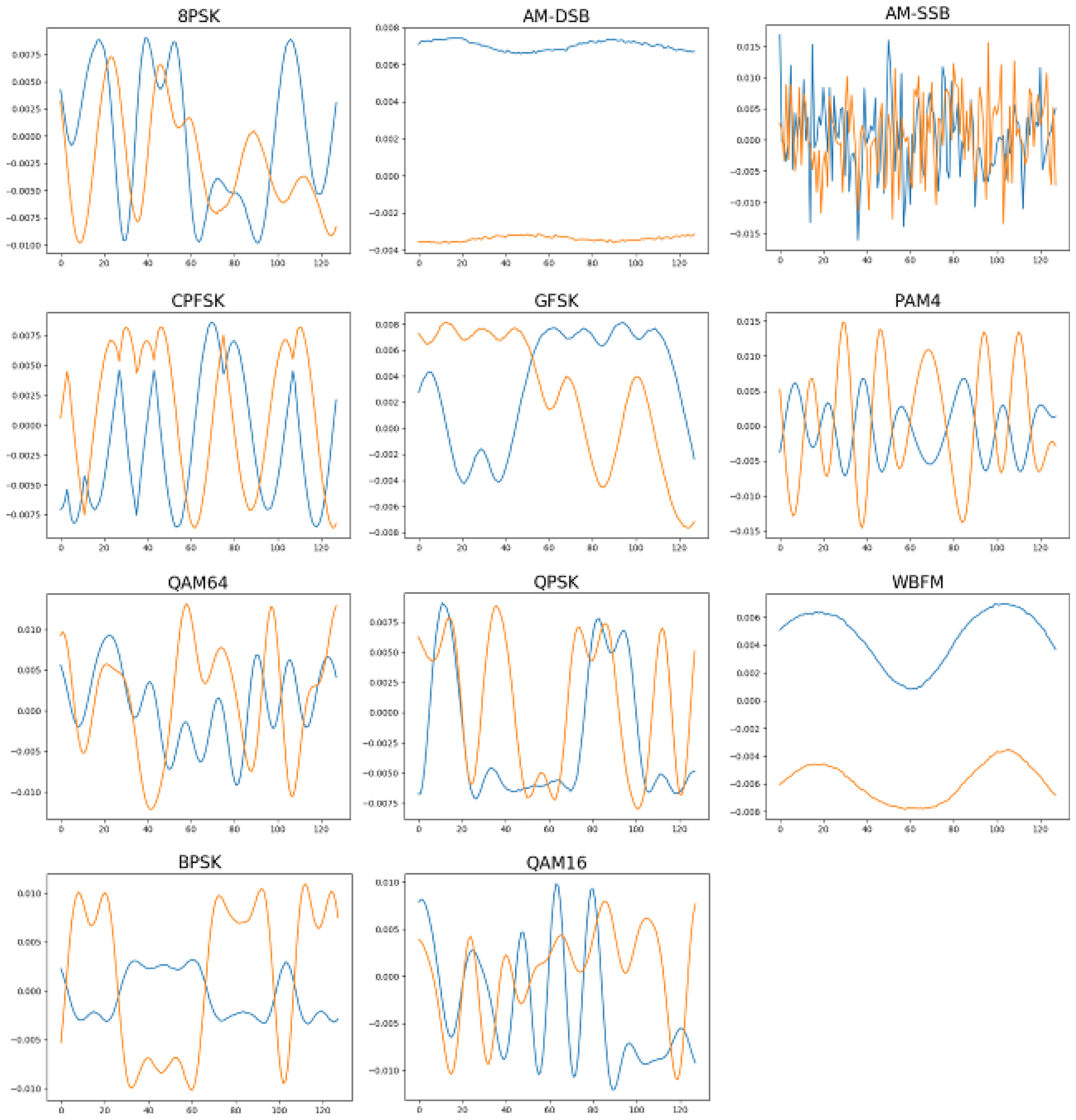 To test the algorithm proposed in this paper, we conducted experiments on the open-source simulation dataset RML 2016.10A designed by DeepSiG [20], which includes 8 digital modulation types BPSK, QPSK, 8PSK, 16QAM, 64QAM, BFSK, CPFSK, and PAM4, and 3 analog modulation WB-FM, AM-SSB, and AM-DSB. The signal–noise-ration (SNR) range covers − 20 ~ 18 dB. The dataset contains 220,000 samples and each sample contains two IQ quadrature signals, and the length of each sample is 128 points. All data were normalized to zero mean and unit variance. The time domain waveforms for 11 modulation styles of high-SNR are shown in Fig. 3. The ratio of training, validation, and test set is 7:2:1.