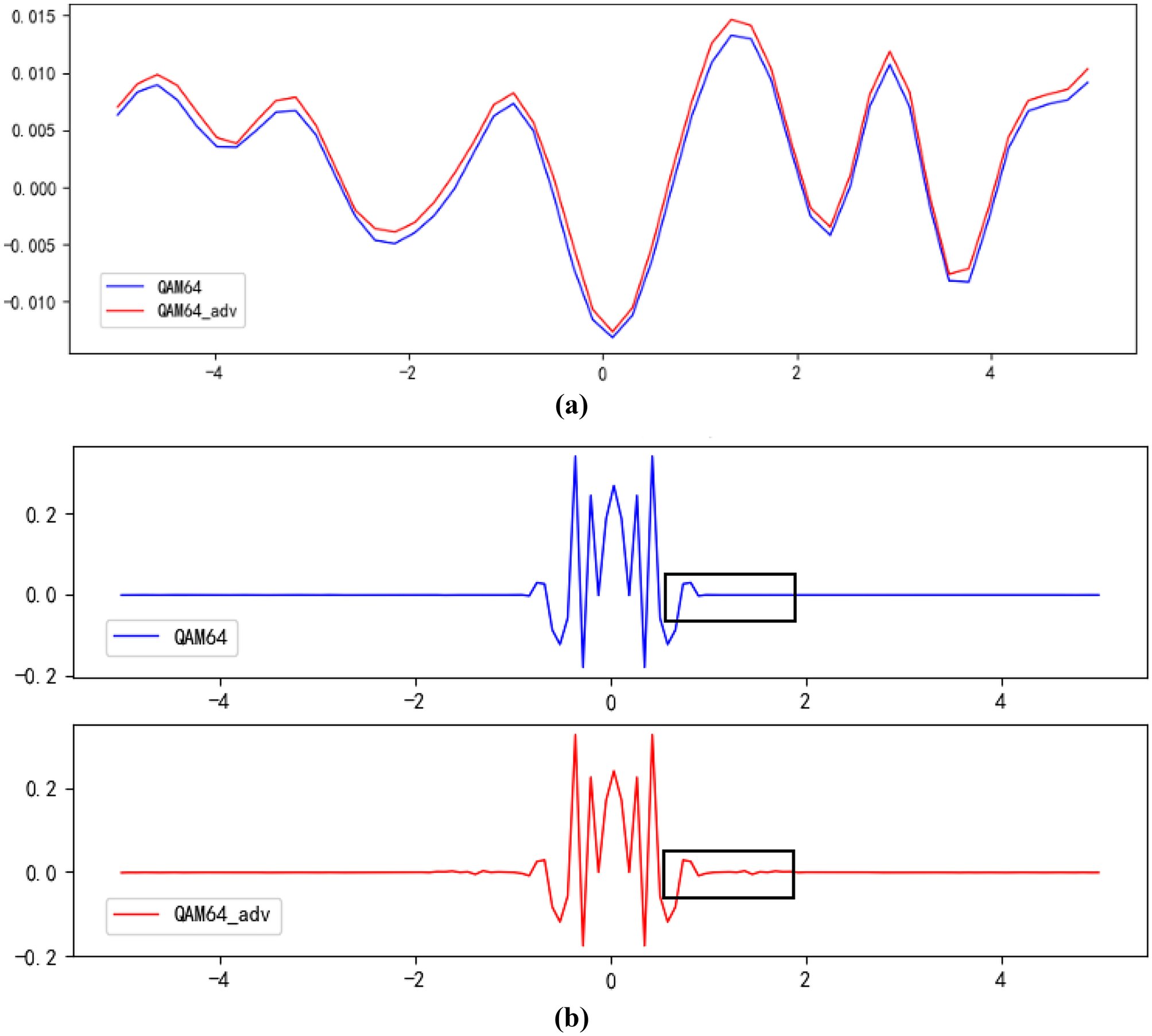 Time domain waveform and spectrum of 64QAM modulated signals. a The time domain waveform of 64QAM modulated signal. The blue curve is the original 64QAM modulated signal, and the red curve is the adversarial example. The vertical coordinates of the adversarial example signal are artificially adjusted to show the differences. b The spectrum of modulated signal. The blue curve is the original 64QAM modulated signal, and the red curve is the adversarial example