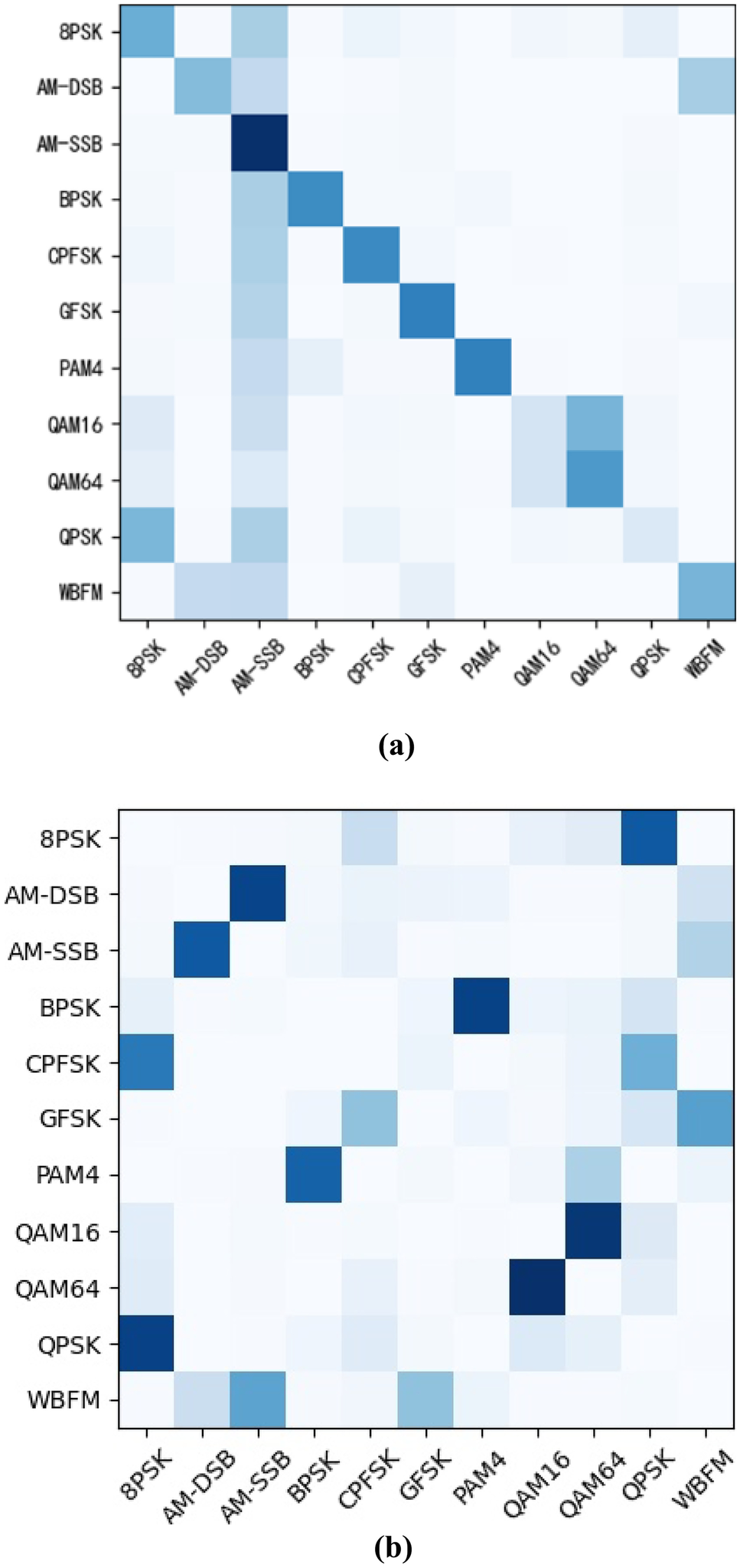For each modulated signal, the corresponding adversarial example signal is calculated and fed to the already trained neural network. The confusion matrix after classification is shown in Fig. 5. Figure 5a shows the confusion matrix in which the classifier VT_CNN2 identifies the original signals. Most of the signals are classified correctly. Figure 5b shows the confusion matrix in which the classifier classified the signals attacked by the proposed method. It can be seen that the matrix approximates a symmetric matrix, indicating that some particular classes are easily confused with each other, such as {AM-DSB, AM-SSB}, {QAM16, QAM64}, {8PSK, QPSK}, and {BPSK, PAM4}. This conclusion will guide subsequent research to further explore the weaknesses of the classifier.