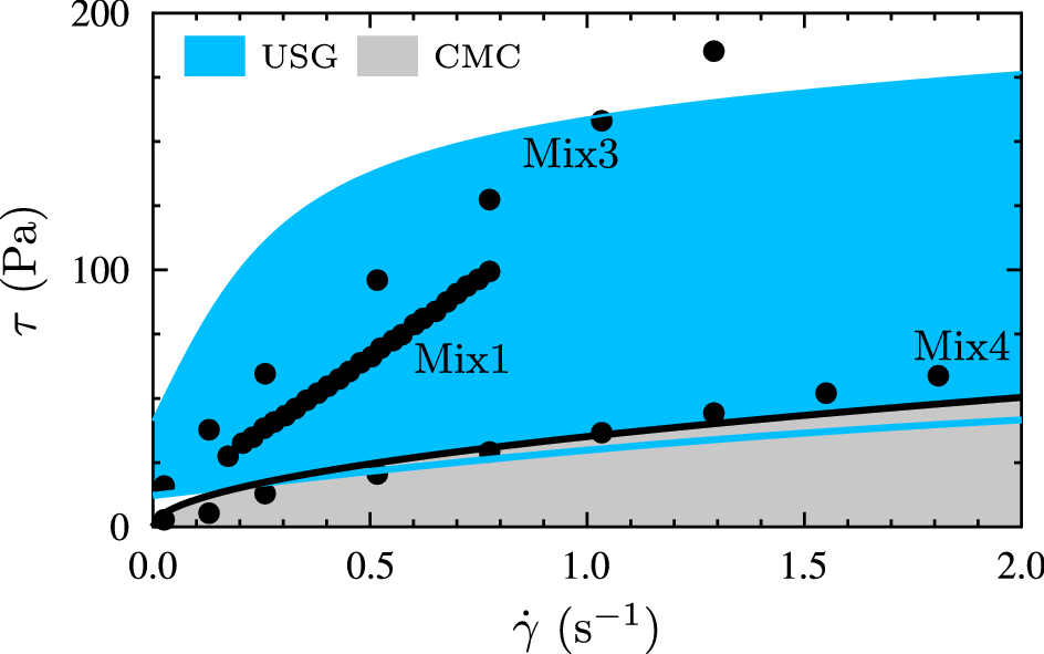 The rheological properties of Mix1 were measured using the anchor agitator system at \(20.5~^\circ \textrm{C}\). As it was mentioned, torque measurement was provided by an RC 20 rheometer with a range of \(50~\mathrm {mN\,m}\). The size of the torque meter range limited the measurement range, as will be recognized further from the measured flow curve. For this reason, further measurements of the rheological properties of Mix2, Mix3, and Mix4 samples were already performed at the mixing station of our design equipped with a torque sensor with a larger range. The eccentrically placed screw agitator was then used as a measuring system to measure the rheological properties of the samples. The measurement of the Mix2 mixture was performed at a temperature of \(22.4~^\circ \textrm{C}\) with a torque sensor with a range of \(5~\mathrm {N\,m}\). Measurements of the properties of the Mix3 and Mix4 samples were performed at a temperature of \(22.8~^\circ \textrm{C}\) using a torque sensor with a range of \(0.5~\mathrm {N\,m}\).