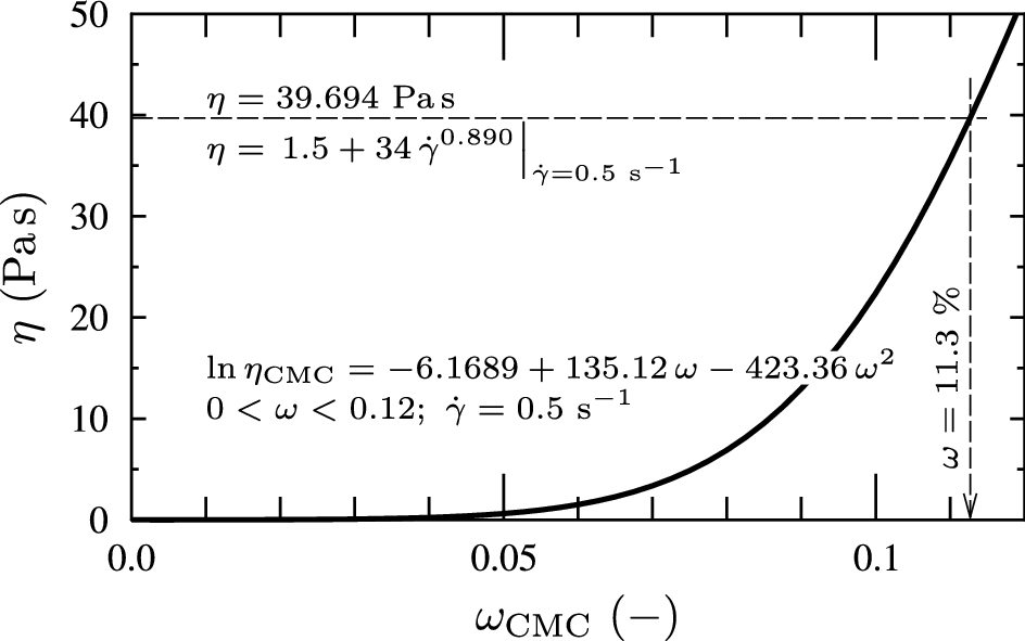 Dependence of CMC apparent viscosity on solution fraction at the shear rate \(0.5~\mathrm {s^{-1}}\)