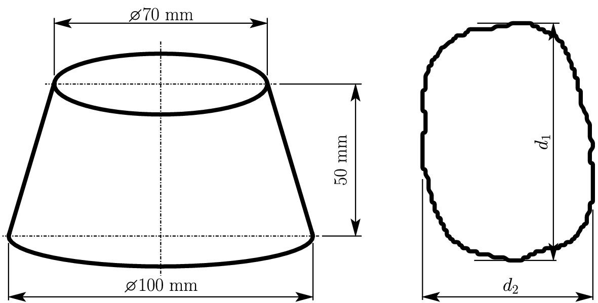 Workability is one of the basic factors that can determine the rheological parameters of UHPC [10]. A mini-flow desk test (see Fig. 1) is one of the testing methods for the workability. It is carried out using a small Hägermann cone that is primarily used for the workability test of fresh mortar according to EN 1015-3. The UHPC workability testing is similar to a slump flow test used for common concrete according to EN 12350-8. The Hägermann cone, which is made of stainless steel or brass, is filled with the sample and then quickly lifted from a desk, which causes the fluid inside to create a circular spillage whose diameter is measured in time. The height of the used cone was \(50~\textrm{mm}\) and its diameters were \(100~\textrm{mm}\) at the bottom and \(70~\textrm{mm}\) at the top [5]. The cone is shown in Fig. 1. A square steel desk plate with an edge length of \(400~\textrm{mm}\) was used below the cone. Both, the cone and the plate, were lubricated by a low viscosity oil prior to each experiment. The results of the workability tests are shown in Table 2.