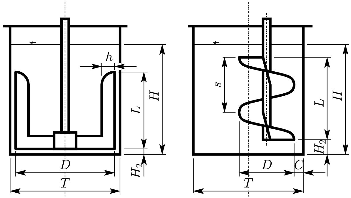 Dimensions of the anchor agitator measuring system, on the left, and the eccentric screw agitator measuring system, on the right