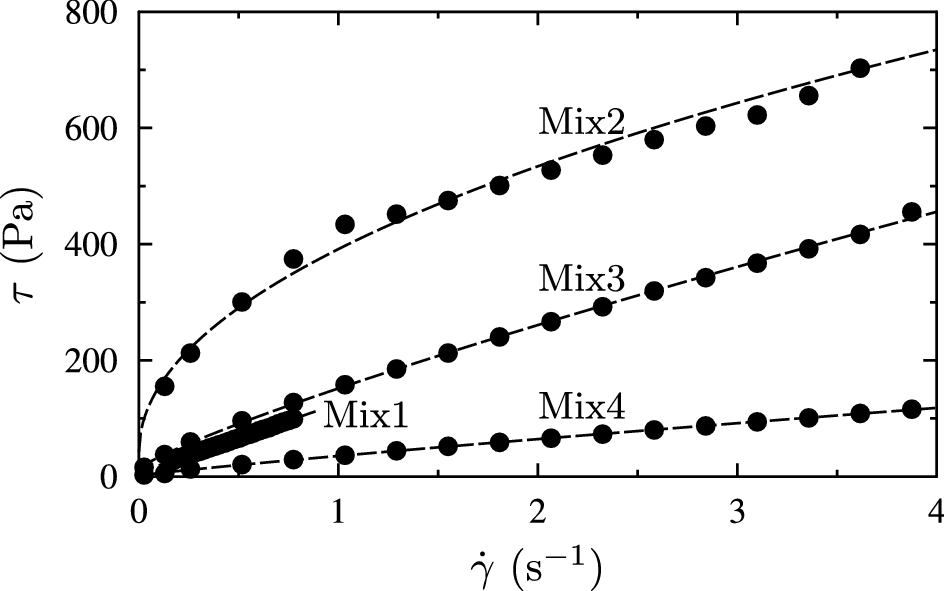 This empirical model additionally contains the parameter c, which adds non-linearity to the Bingham fluids in the form of quadratic dependence of the shear stress on the shear rate [3, 6‐8]. This term enables us to model the slight shear thickening behaviour of mixtures.