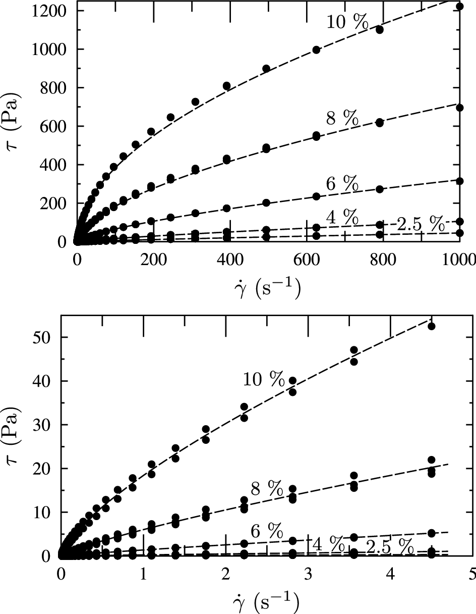 Flow curves of aqueous solutions of CMC with specified fractions. The flow curves up to shear rate \(1000~\mathrm {s^{-1}}\) are shown in the upper graph; for a range of shear rate up to \(4.5~\mathrm {s^{-1}}\) are shown in the lower graph