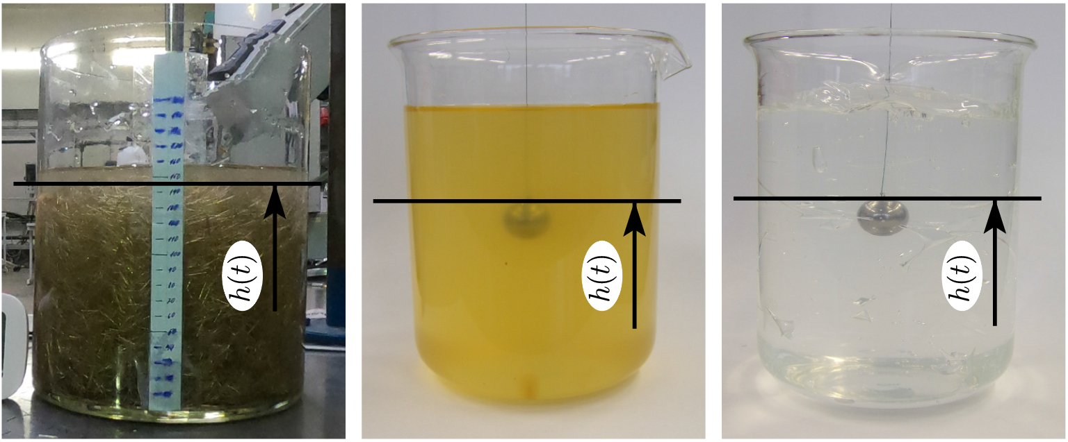 Subsequently, the rheological behaviour of two model liquids, aqueous solutions of CMC and USG, was measured. It turns out that these fluids can be used, with the advantage of their transparency (see Fig. 9), as model fluids that enable the modelling of hydrodynamic processes in real UHPC mixtures. For example, in our further research, we studied the settling velocity of a cloud of metal fibres in the model fluids at different rheological parameters of the fluids corresponding to different UHPC samples. The settling velocity was evaluated by tracking the position of the fibres cloud interface over time using image analysis in camera records (see the cloud height in Fig. 9 left). It was a very cheap, fast and simple way of evaluating the settling velocity. The orientation of the fibres could also be observed during the experiments. The results of the experiments in the model fluids could be compared later with the distribution of fibres in real UHPC samples evaluated in cuts made in the solidified samples. Regarding the transparency of the model fluid, it should be noted that in the case of the CMC solution, a change in colour was observed over time (compare the first two photographs in Fig. 9).