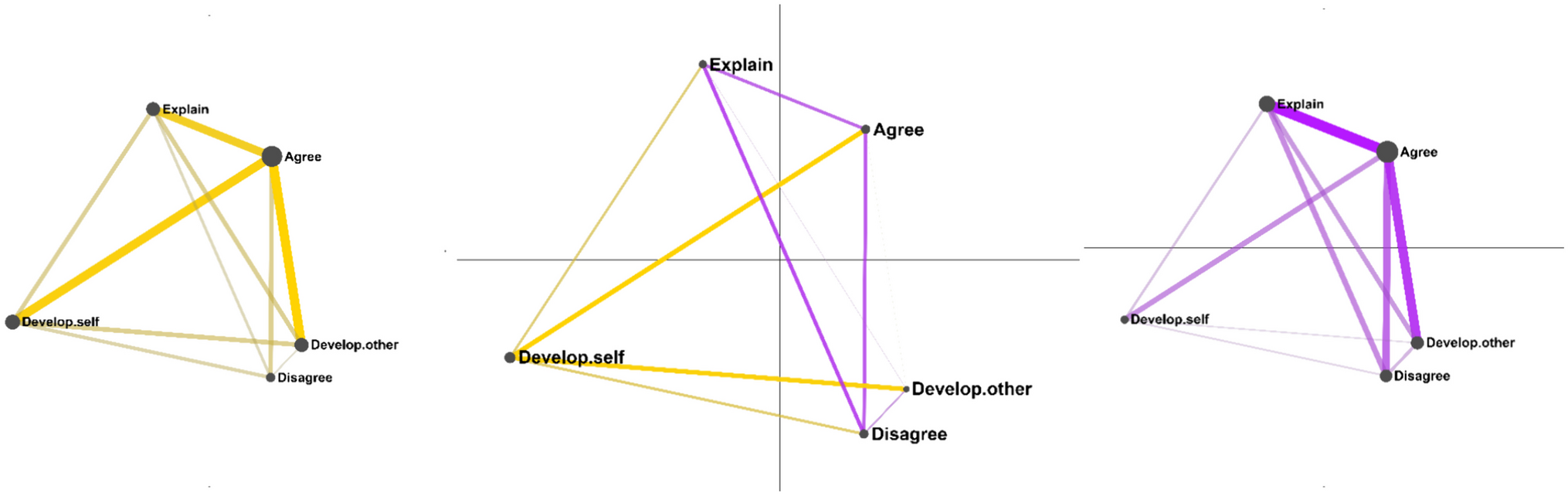 Our first findings explore the potential use of ENA to model different talk orientations. Specifically, we focus on groups A and B, as instantiations of Cumulative and Disputational Talk. As can be seen in Fig. 1, group A’s (left, yellow) discourse revolved around agreement, which was connected to developing one’s or developing other’s ideas, and to explaining ideas already introduced. In this respect, it is a rather clear manifestation of Cumulative Talk in which participants build on each other’s ideas, yet they do so while avoiding disagreement. In comparison, although group B members (Fig. 1, right, purple) also engage in agree and develop-other moves, the network is characterized by higher levels of disagreement. More importantly, as seen in the difference graph (Fig. 1, center), both agreeing and disagreeing are connected to explain moves, meaning that they do not lead to the development of new ideas, but rather to the reiteration and clarification of ideas discussed earlier. Moreover, disagreements are not connected to either developing one’s own ideas or those of others. Thus, we contend that attention to the connections between the different communicative acts is central to distinguishing the various patterns of group talk in ways that are not apparent from merely counting the relative frequency of different codes.
