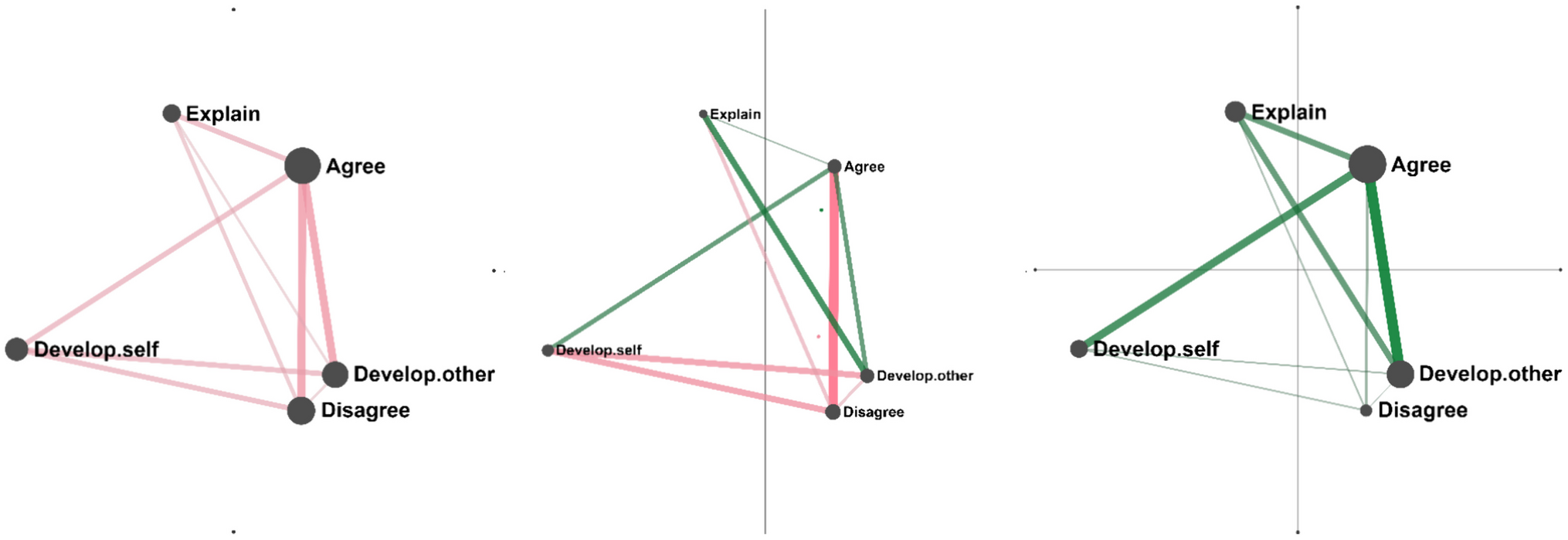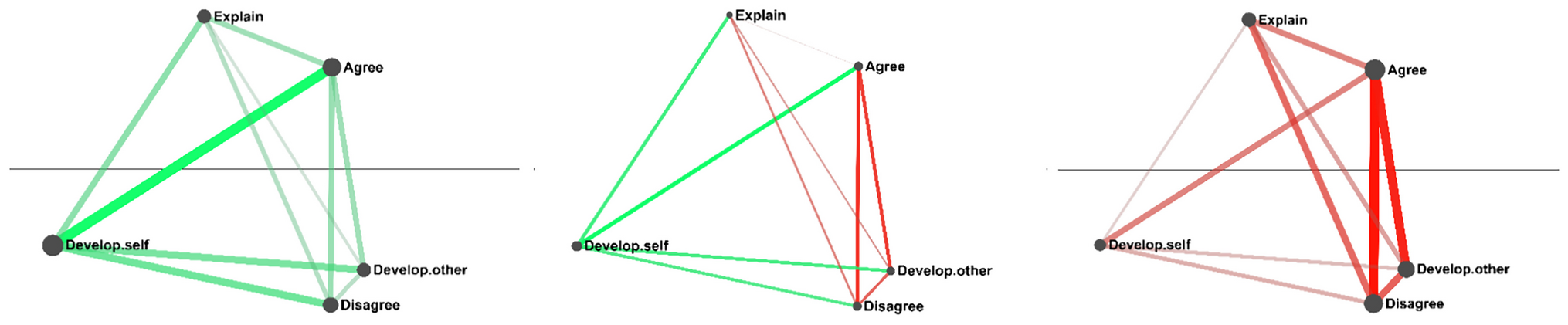 In this study, we relied on the unique affordances offered by ENA to study group dialogue. To this end, we coded five basic communicative acts (agree, disagree, develop-self, develop-other, and explain) with the goal of identifying group patterns of discourse based on the co-occurrence of the same set of basic codes at the group and individual level. As in previous studies, we utilized ENA to uncover connections within the data that were not detectable by conventional coding-and-counting analyses (Csanadi et al., 2018), and more specifically, highlighting the frequent connections between different types of talk students made as they worked collaboratively (Vandernberg et al., 2021). This was done by showcasing the structure of discourse analysis networks (focusing on Exploratory Talk) in terms of temporal co-occurrence, measuring those patterns, examining individuals’ contribution to the group level network, and interpreting the differences between the patterns observed in the network visualizations.