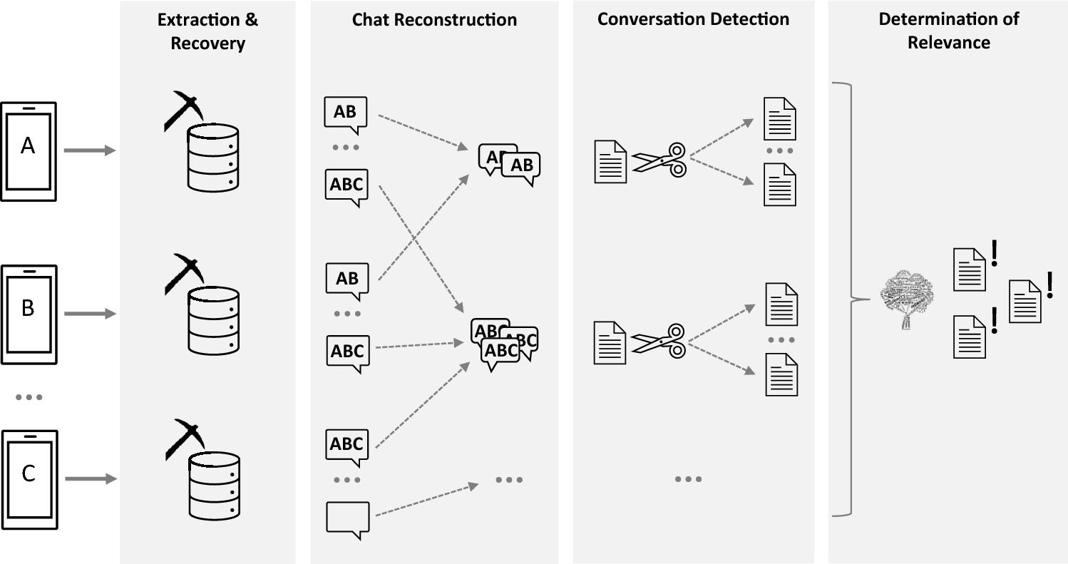 In a first step, the messenger data from different devices is linked together, allowing the communication history to be reconstructed almost completely. As a positive side effect, deduplication significantly reduces the reading effort. The next step is to divide the chat history messages into temporally related conversations, which preserves the context of a message and reduces the need to match each relevant message. At the same time, the associated context preservation simplifies the interpretation of the results by investigators. In a final step, process-relevant conversations are filtered with the help of a semantic rule-based knowledge base, the so-called term tree, which again drastically reduces the search effort.