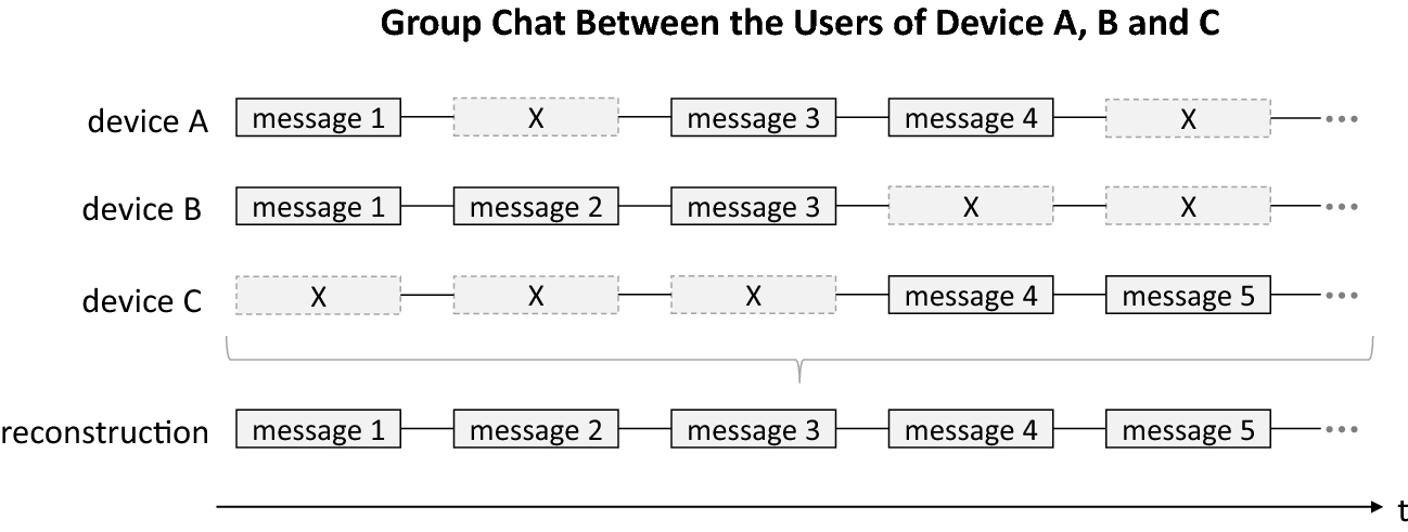 Complete reconstruction of a group chat using three devices. Devices A, B and C each contain their own versions of the common group chat, which have gaps at different points in time. A gap marked as dashed and with “X” represents a deleted or not received message. Merging the different versions leads to the reconstruction of the complete chat history