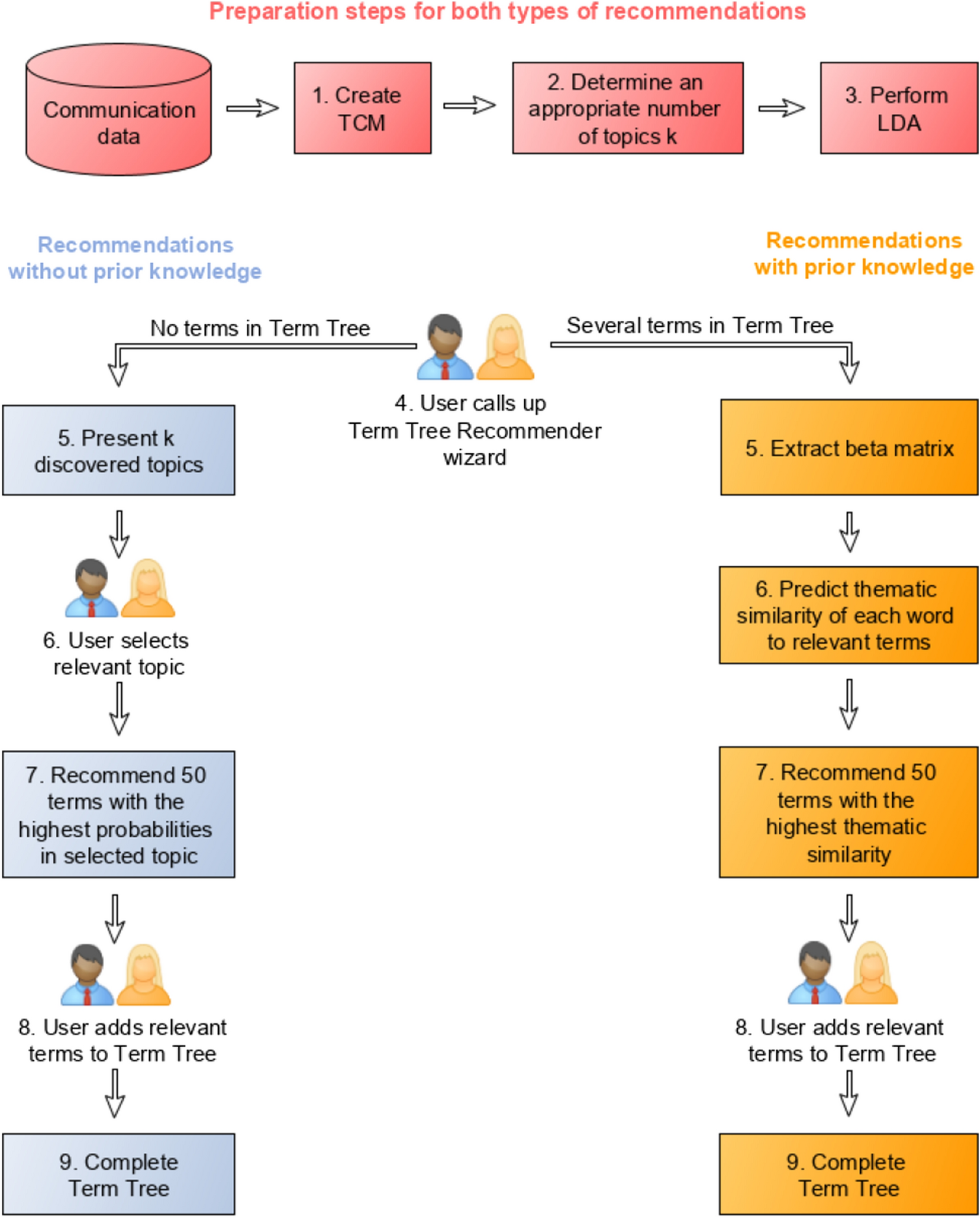 Structure of the Term Tree Recommender. The Recommender can provide recommendations with or without prior knowledge. The algorithm is based on an LDA over the entire communications network