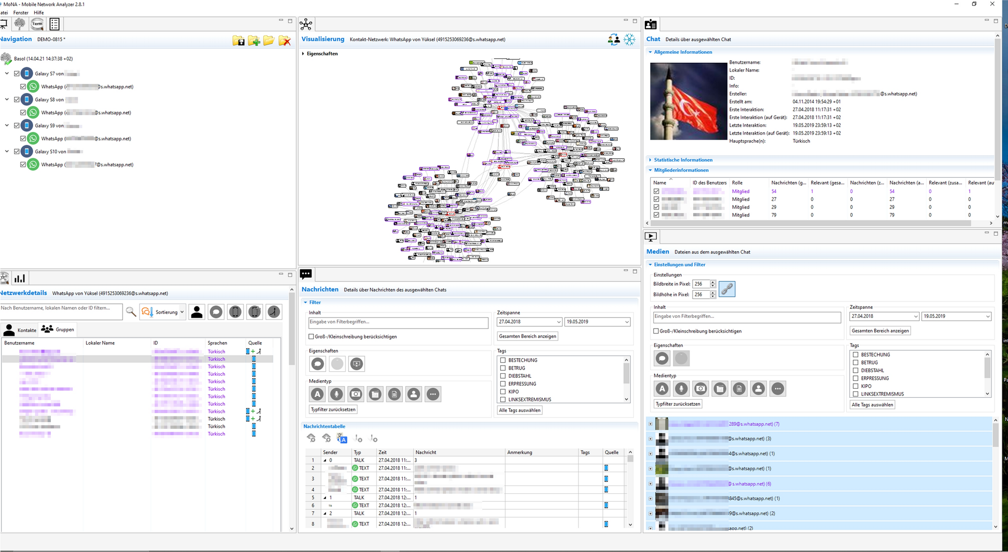 The proposed process chain has been implemented in a prototype application, the Mobile Network Analyzer (MoNA), and is currently being evaluated by various investigative agencies (see Fig. 5). A time-limited trial version is available for download1, along with instructions for obtaining unrestricted usage rights. Nevertheless, the current implementation is limited to the messengers WhatsApp, Facebook and Telegram. Future research will address the reverse engineering of further communication services. The results will be integrated into upcoming versions of MoNA at irregular intervals. Furthermore, the joint semantic analysis of different modalities currently places high demands on the hardware and is therefore not included in the trial version.