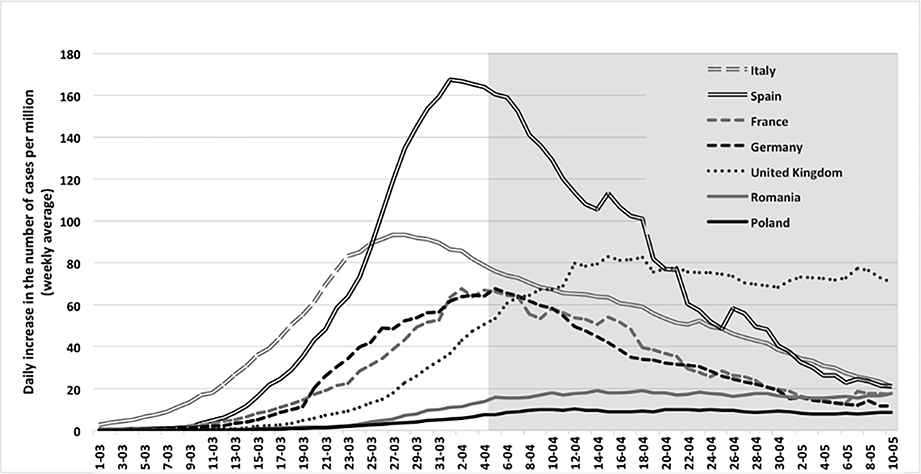 Daily increase in the number of cases (weekly average) per million. (Note. The United Kingdom and the six largest EU countries (Italy, France, Germany, Poland, Romania, and Spain) are represented. The grey shading represents the period after April 5. Source: Johns Hopkins CRC (2020); CIA Factbook (2020).)