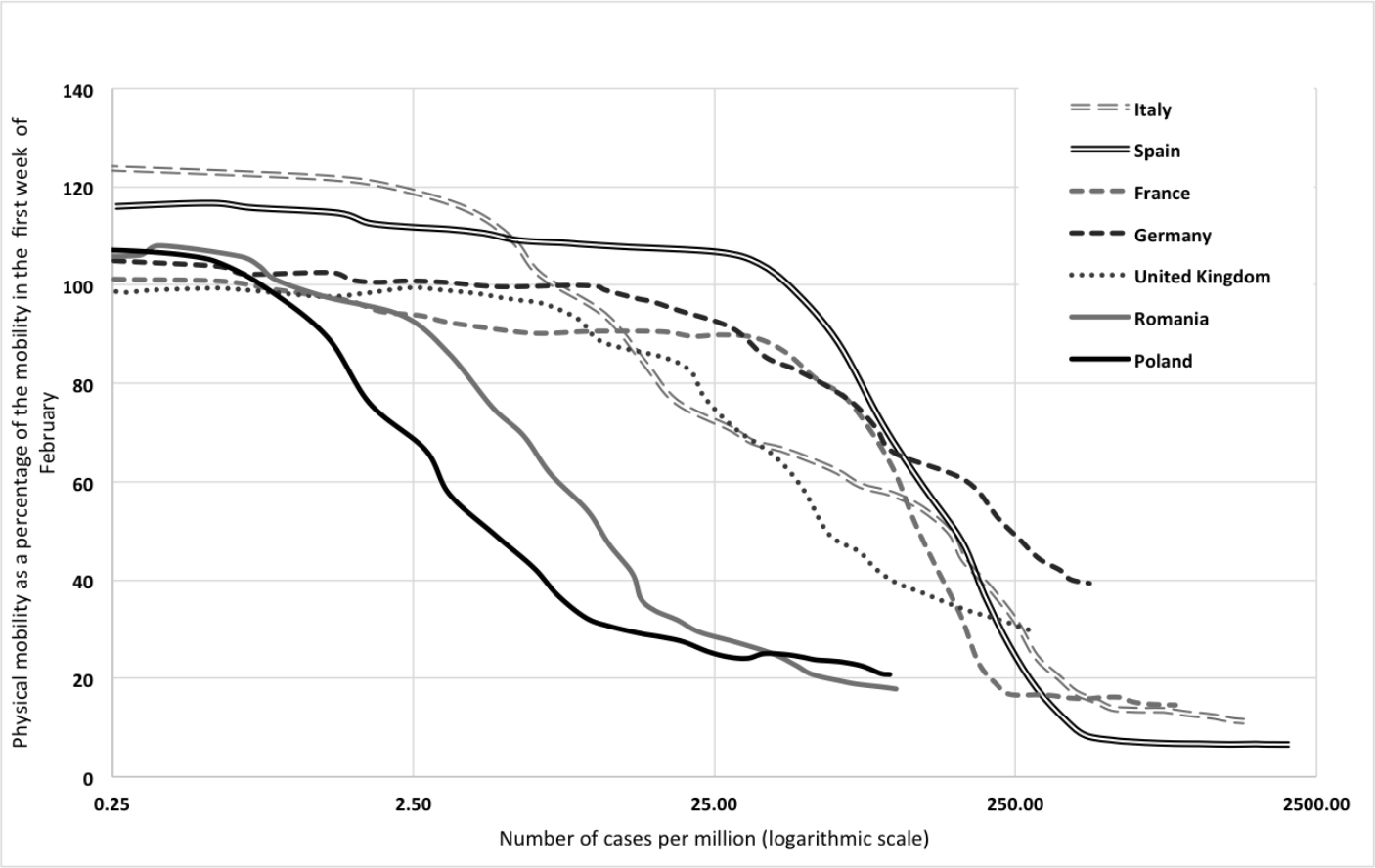 The government’s fast reaction, combined with the citizens’ discipline, resulted in the suppression of the virus’s spread in Poland. Its containment was especially striking when compared with other large EU countries or the United Kingdom (see Fig. 1). The physical mobility index indicated that Poles quickly limited their activity at low levels of infections, thereby reducing the nation’s infection rate (see Fig. 2). Poland, however, was not the only one; other Central-Eastern European countries, such as Romania, also managed to keep their curves’ flat.1