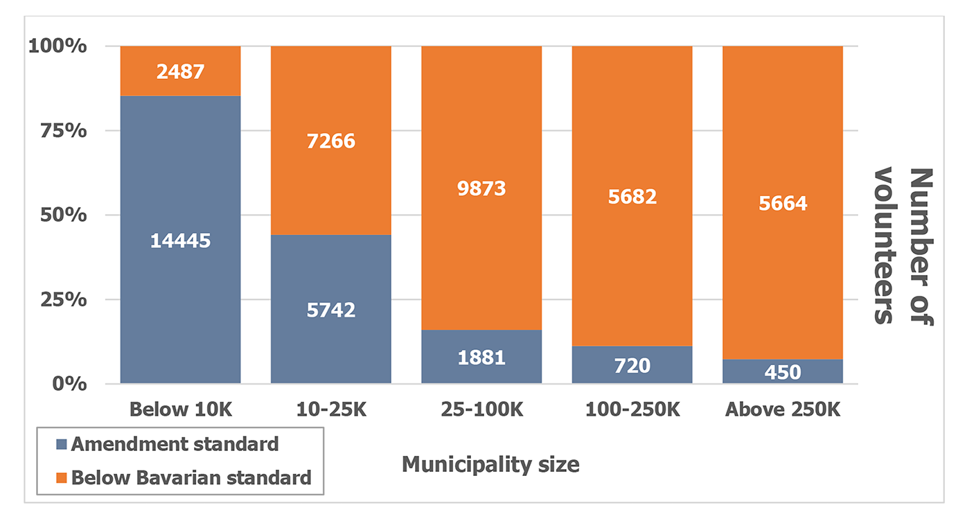 Election opponents argued that the logistics needed would lead to mistakes and that the low number of volunteers, as detailed in the electoral law amendment, would slow down the pace of counting votes and would threaten a possible runoff planned two weeks later. The expected deficits of volunteers would be largest in the nation’s biggest cities. Figure 3 shows the number of volunteers in the amendment compared to the number of volunteers for the Bavarian mail-only election by municipality size (Flis and Ciszewski 2020).