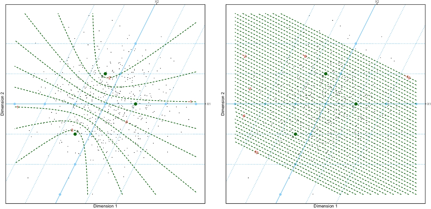 Example configuration with two predictor variables and three classes. The predictor variables are represented with variable axis, the response classes by points. Also included are iso-log-odds lines for the log-odds of class A against B, that are, the green dashed lines. Left for the distance model, right for the squared distance model
