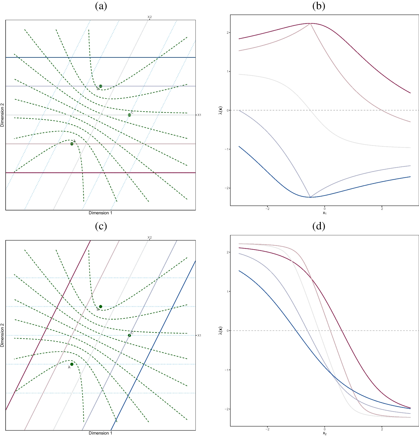 Figure 3(a) and (c) show the iso-log-odds curves of A against B again. In Fig. 3(a) we added five horizontal lines representing variable \(x_1\) conditional on five different values for \(x_2\) (i.e., −2 (red), −1, 0, 1, 2 (blue)). These lines are variable sub-axes. In Fig. 3 (c) we added five lines representing variable \(x_2\) conditional on five different values for \(x_1\) (i.e., −2 (red), −1, 0, 1, 2 (blue)). These lines correspond to the grid displayed in Fig. 1. In Fig. 3(b), we show \(\lambda (\textbf{x})\) when we move from left to right over the five lines in (a). An increase in \(x_1\) results for the negative values of \(x_2\) (red curves) first in an increase followed by a decrease in log-odds. When \(x_2 = 0\) the log-odds monotonically decrease (gray curve), whereas for the positive values of \(x_2\) (blue curves) there is first a decrease followed by an increase in log-odds. In Fig. 3(d), we show \(\lambda (\textbf{x})\) when we move over the five lines in (c). In this case, where the variable of interest (\(x_2\)) is parallel to the AB line, all log-odds values are decreasing, but not at the same rate. The steepest curves are found for a value where the variable sub-axes is cutting the two class points.
