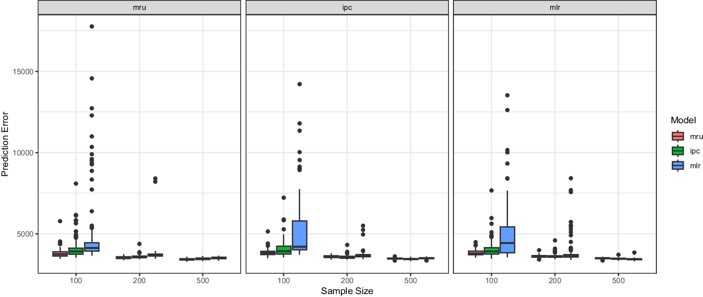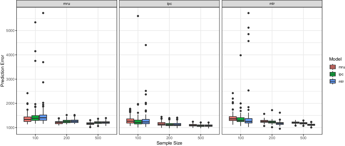In a simulation study (Section 4.2), we compared the predictive performance of the distance model (mru) against the predictive performance of the squared distance model (ipc) and multinomial logistic regression (mlr). A main finding of this simulation study is that the distance model is less vulnerable to overfitting in the case of small sample sizes. The prediction errors for both the squared distance model and multinomial logistic regression have much larger outliers (see Figs. 4 and 5). Furthermore, for the populations based on the Dutch Election data, the distance model consistently outperforms the two other model in terms of prediction error for small sample sizes.