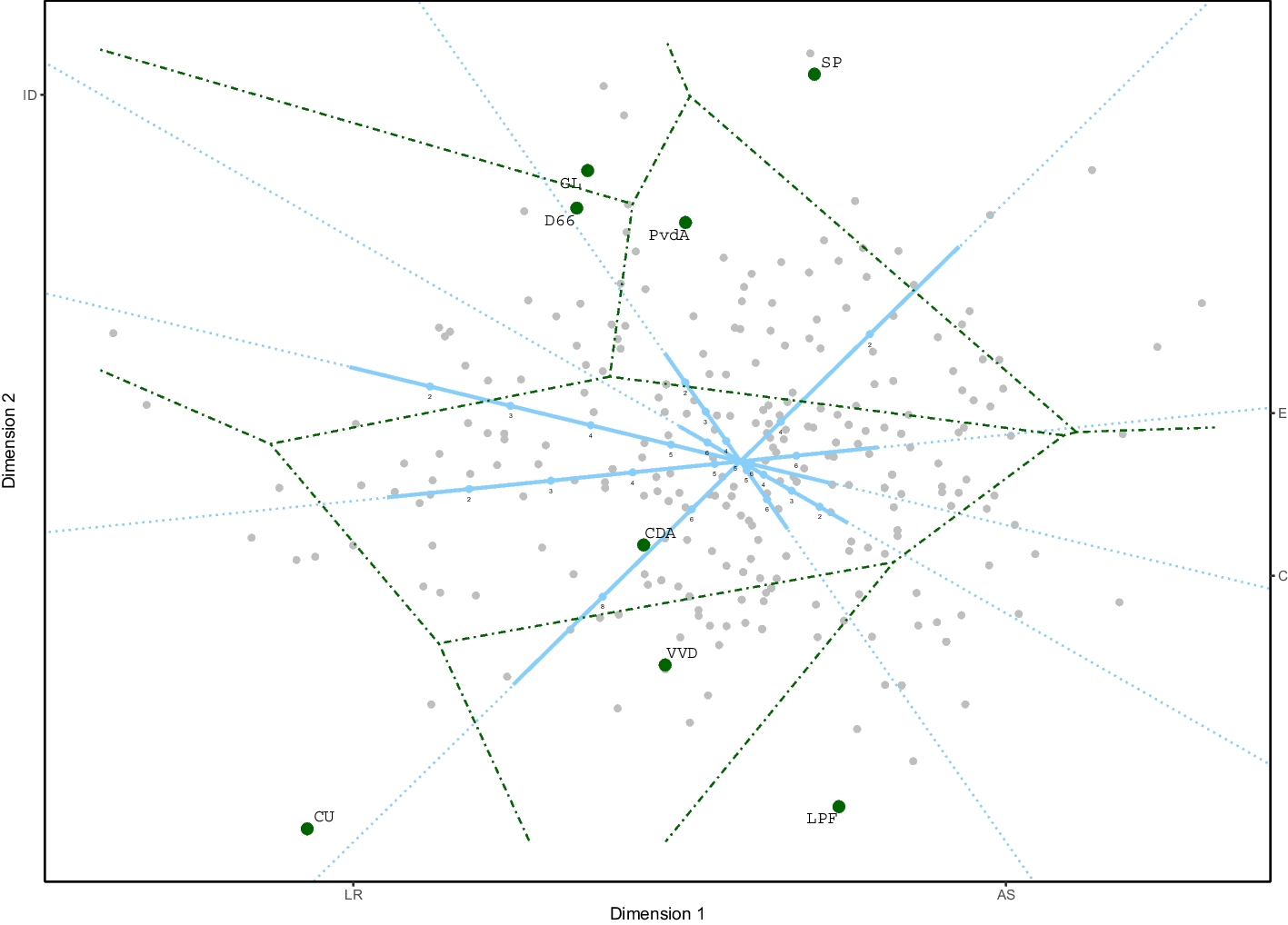 The final representation of the data is shown in Fig. 7. The results show a cluster of left-wing parties (SP, PvdA, D66, and GL) at the top and a cluster of more right-wing parties (CDA, VVD, LPF and CU) at the bottom. Predictor variables with a large effect are left-right self scaling (LR), crime (C), and euthanasia (E), while asylum seekers (AS) and income differences (ID) have smaller effects as can be seen from the length of the solid part of the variable axes.