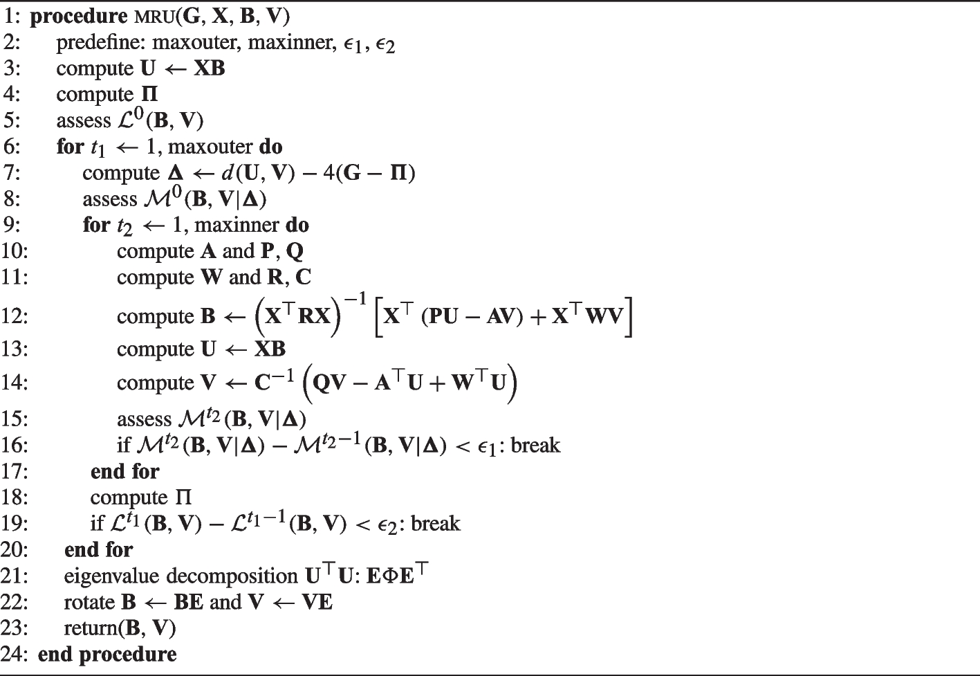 where \(\epsilon \) is a small positive constant. Heiser (1991) showed that with these redefined matrices we can still use the standard updating formulas (2) and (3). Repeatedly updating \(\textbf{B}\) and \(\textbf{V}\) and setting \(\textbf{U} = \textbf{XB}\), adapting \(\textbf{A}\) and \(\textbf{W}\) in each step minimizes the negative log-likelihood.
