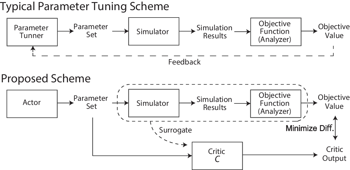 In the proposed method, we employed actor-critic-based deep reinforcement learning methods with continuous action spaces, such as DDPG [48] and SAC [49, 50]. We selected these for the following reasons. First, Figure 1 shows the typical parameter tuning and our proposed schemes. At the tuning trial in the usual parameter tuning scheme, the parameter tuner provides a parameter set for the parameter-tuning task. Subsequently, the simulator runs using the parameter set and returns the results, and the analyzer (objective function) returns the final objective value. Finally, the parameter tuner receives feedback and attempts to modify the parameter set to maximize the objective value. To consider this scheme down to the reinforcement learning scheme, the actor-critic framework exhibits a good fit, as illustrated in Figure 1. Second, the typical parameter-tuning tasks and parameter sets frequently include continuous values; therefore, support of continuous values is required. The illustration in Figure 1 represents the basic outline of our methods; however, the details are not exactly the same as illustrated and explained hereafter.