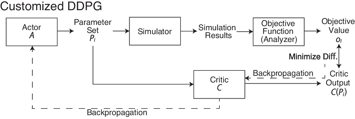 because our actor learns to maximize the objective value estimated by our critic. Thus, by minimizing \(L_{C}\) and \(L_{A}\) alternately, our critic pursues the correct evaluation for a given parameter set and our actor pursues a better parameter set to obtain higher objective values. These procedures are similar to those used for the original DDPG.