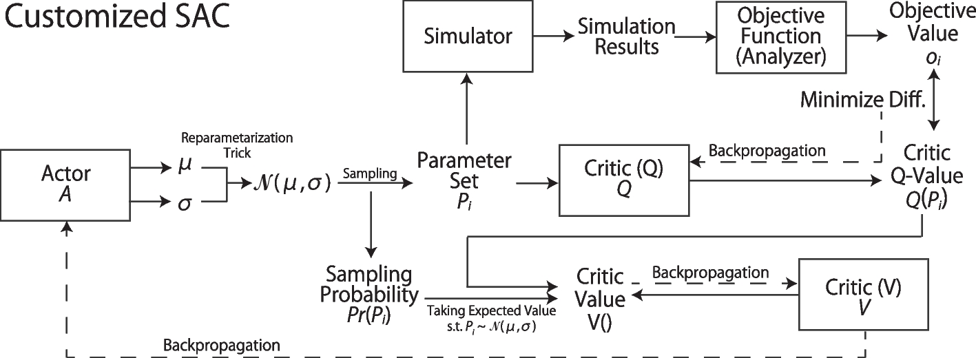 In addition, in a customized SAC, the replay buffer [52], soft target update, and penalty for invalid simulations are employed.