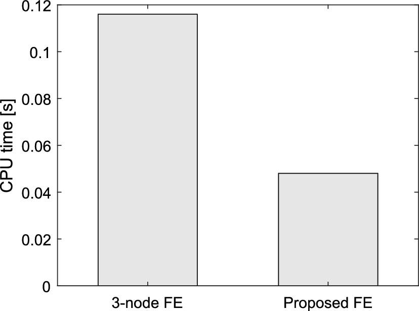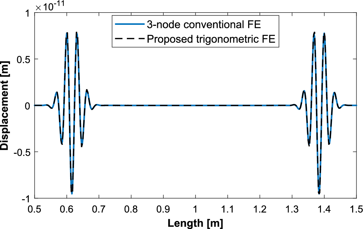 and shown in Fig. 2 in a combined plot. For both the trigonometric and traditional 3-node FE, 100 elements are utilized, so 200 eigenfrequencies are obtained and compared to the analytical equation (14). The eigenfrequencies are equal to the degrees of freedom of the bounded system, namely, the rod after imposing the clamped-free boundary conditions. It is clear that the proposed trigonometric FE outperform the classical 3-node FE for every mode. It should be highlighted that the proposed method results in a significantly smaller value of the spectral radius of the dynamic stiffness. That means that it yields smaller values for the structure’s highest natural frequency that determines the maximum timestep that should be used in explicit integration schemes (Courant–Friedrichs–Lewy condition or CFL condition [46]). In this way, the more accurate prediction of the highest natural frequency plays a pivotal role on the numerical efficiency of transient dynamic simulations, as demonstrated in subsection 3.2. More specifically, the proposed trigonometric FE yield more accurate results on higher frequencies, showing a 17% overestimation of the highest frequency compared to the classical 3-node FE that exhibits 24% overestimation.