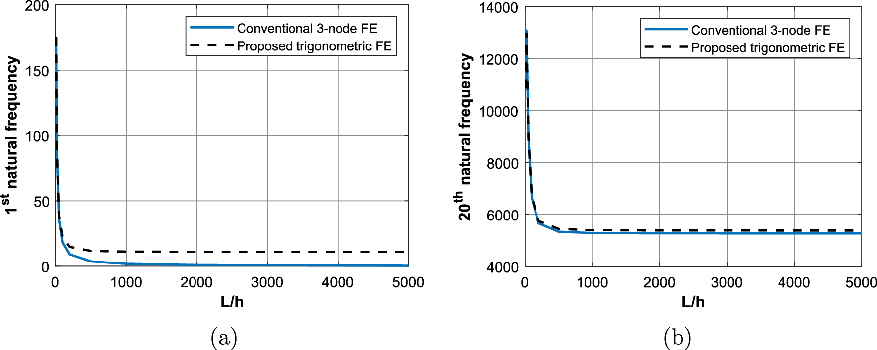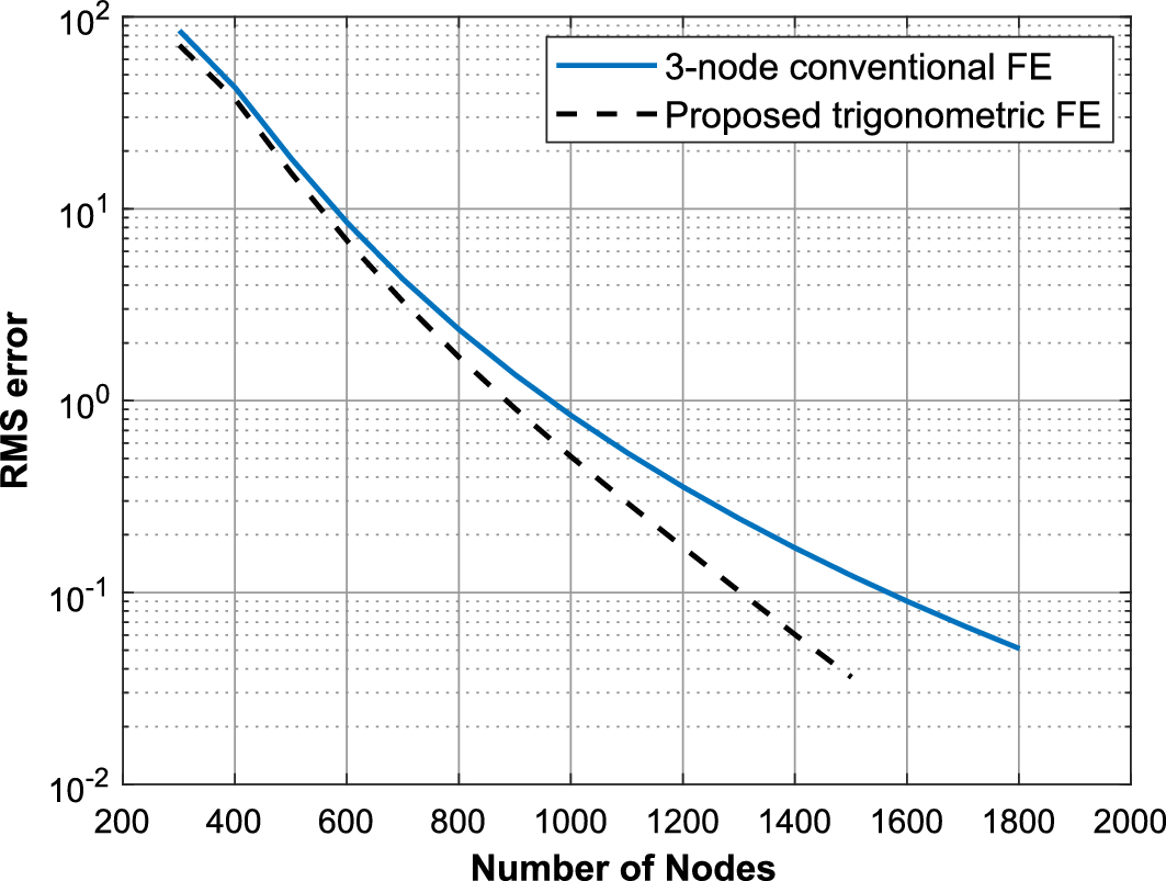 At this point, a convergence analysis is performed for the estimation of the 20th natural frequency, following the procedure described in [47, 48]. The absolute error between the estimated and the analytical 20th natural frequency, as well as the convergence rates as described in [48], is presented in Table 2, for the classic 3-node FE and the proposed trigonometric FE. It is obvious that the proposed FE exhibit lower absolute errors in every discretization case, and the convergence rates of the two models are similar.