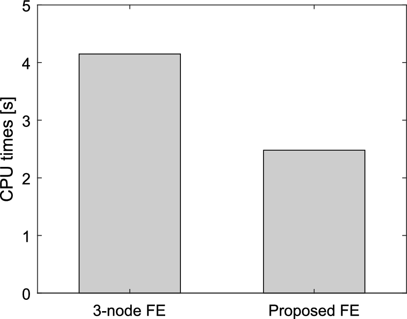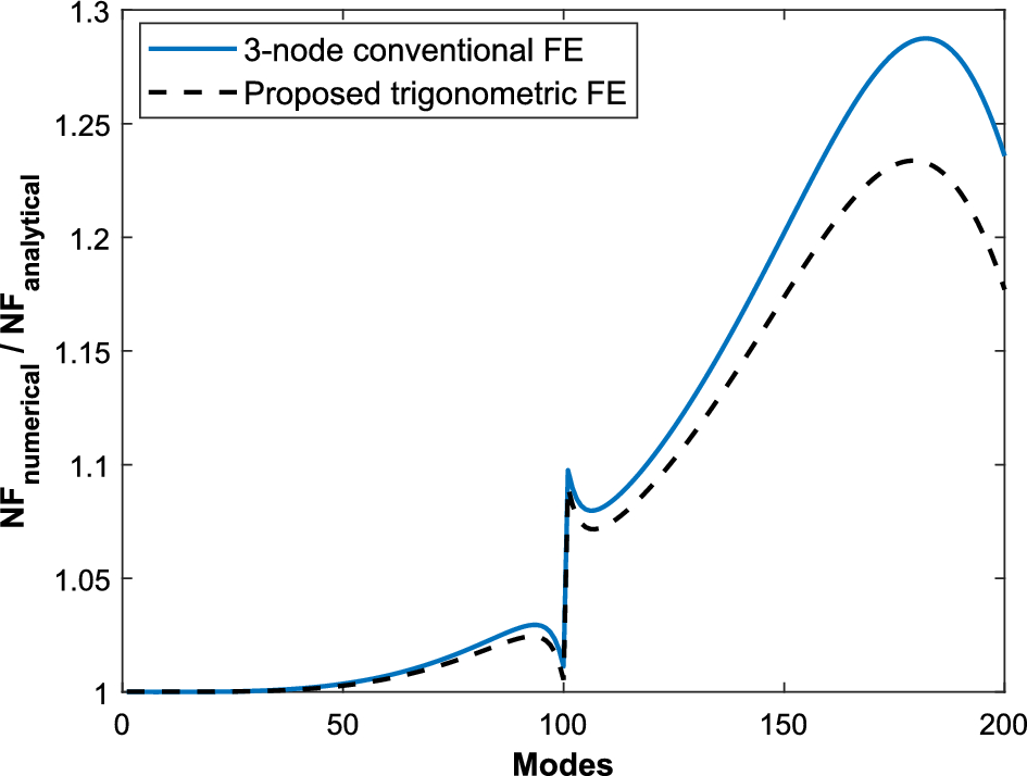 It is obvious that the proposed trigonometric FE outperforms the classical 3-node in the majority of the domain of modes. Note that in the lower-frequency region, the conventional 3-node FE is closer to the analytical solution, but in the medium and high frequencies the trigonometric FE shows better performance. This fact also has an important impact on the allowed timestep for explicit integration, as also mentioned in subsection 3.1.1.