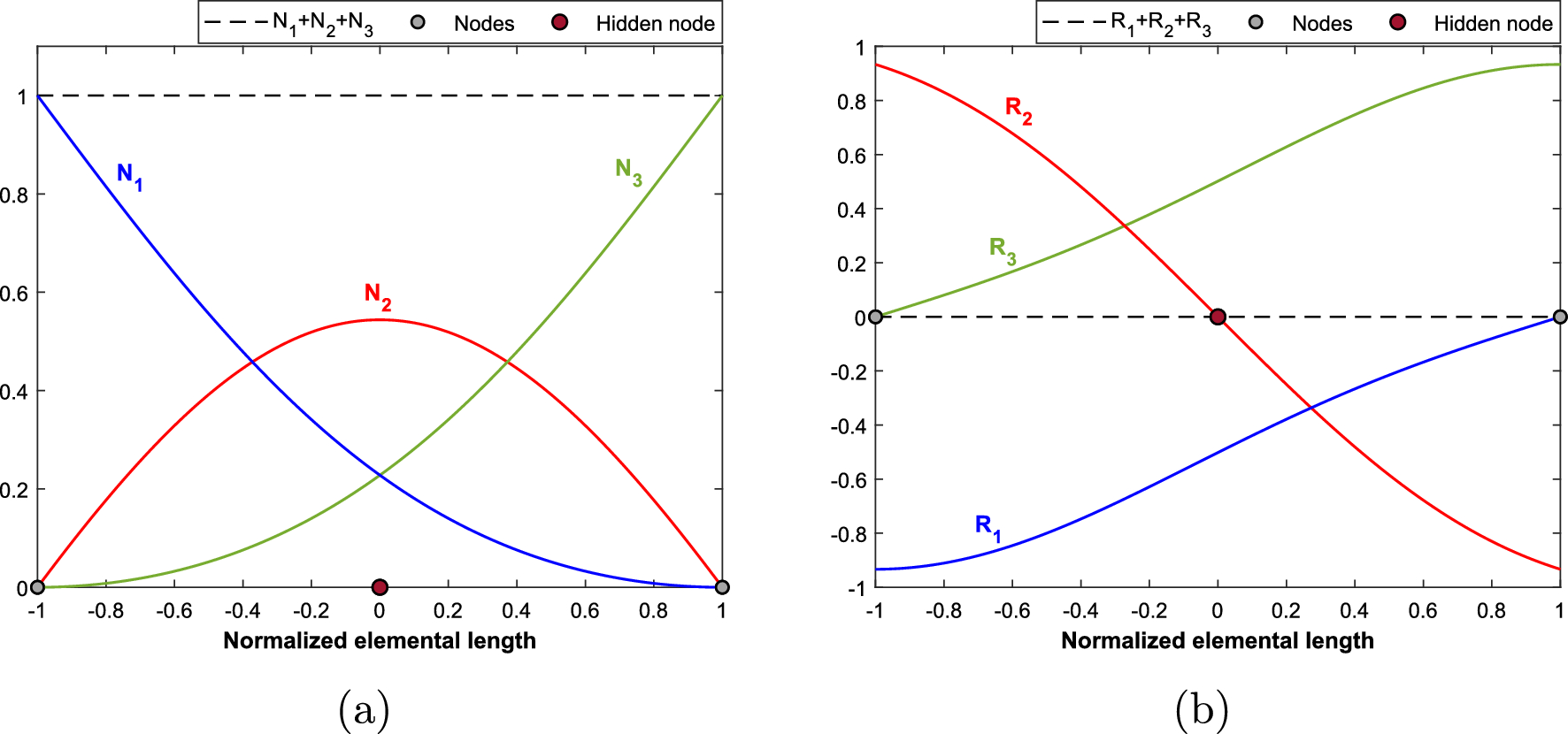 The functions \( N_1 \) and \( N_3 \) were created by satisfying the general continuity conditions of the FE basis functions. However, the shape function of the second node, \(N_2\), does not satisfy the continuity condition of being equal to 1 for node 2 (\(x=L_e/2, \ \xi =0\)). The shape function \(N_2\) is used to ensure that the partition of unity (\(N_1 + N_2 + N_3 = 1\)) is satisfied in the whole domain of the element. The shape functions and their corresponding derivatives (\(R_i=dN_i/dx\)) are presented in Fig. 1. As already mentioned, the selection of the specific basis functions was inspired by the modeshapes of the dynamic response of structures that in general involve trigonometric terms. Also the derivatives of \(N_1\), \(N_2\) and \(N_3\) are smooth, since they are derived from trigonometric functions, and their summation leads to a constant zero value (\(R_1+R_2+R_3=0\)), which is desired, since zero strain is expected when the three displacements of an element have equal values (Fig. 1b).