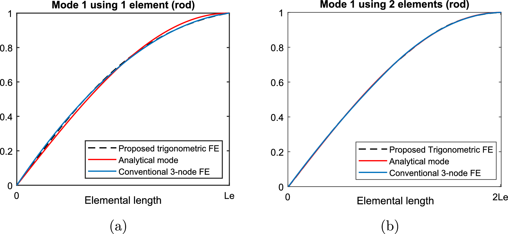 Prediction of rod’s mode 1 using the proposed trigonometric FE and the classic 3-node FE, employing a one element and b two elements. The red line represents the analytical mode 1