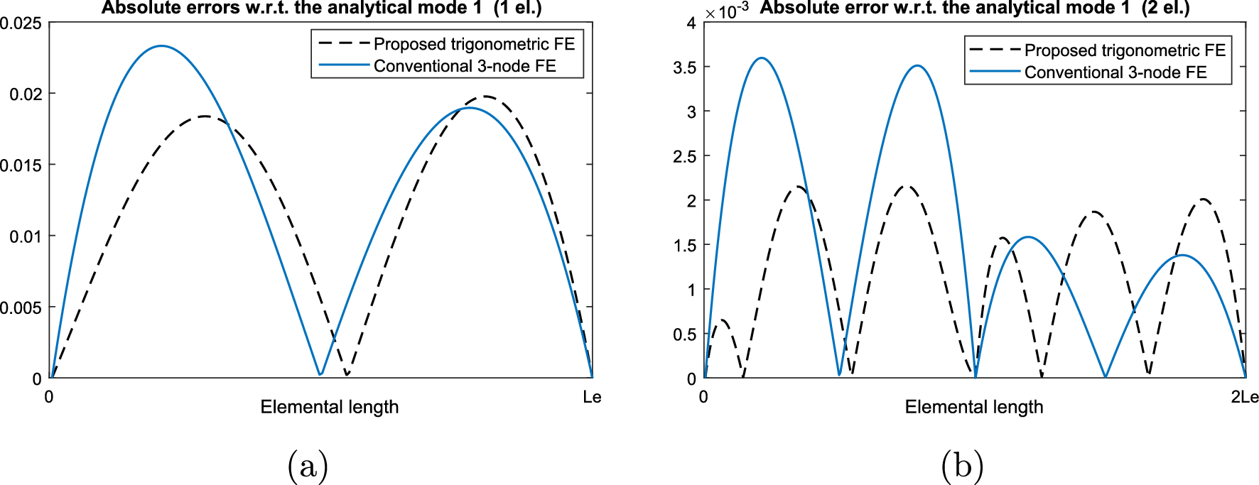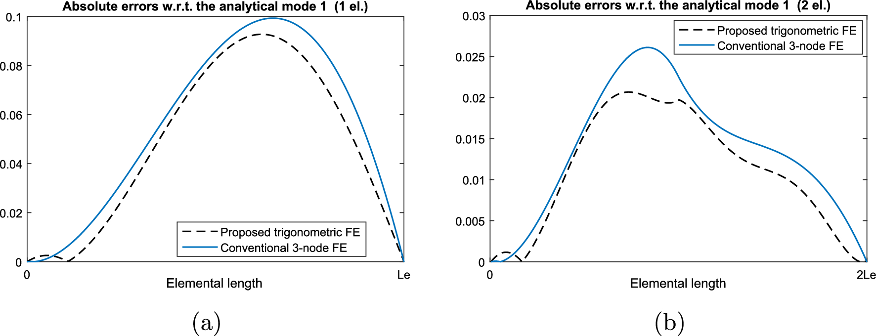 Absolute errors of the prediction of the rod’s first mode by the proposed trigonometric FE and the classic 3-node FE with respect to the analytical mode solution, using a one element and b two elements