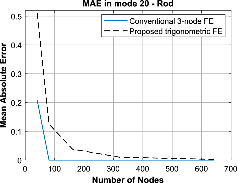 Finally, the convergence characteristics of the proposed elements are compared to the conventional quadratic FE in the estimation of the 20th eigenmode of the rod. The convergence approach described in [47, 48] is utilized, and the error between the predicted and analytical mode is calculated through the mean absolute error (MAE) metric. In Fig. 5 the MAE of each model is shown for each mesh case, and the convergence of both models towards the analytical solution is obvious. However, it can be observed that the conventional 3-node FE converge faster at the coarse discretization regime. This is not related with the interpolation properties of the proposed elements, since the interpolation superiority is already proven in the above case. The difference here is that the estimated mode is compared to the analytical mode only at the nodes’ locations, and it can be deduced that the middle (hidden) nodes of the proposed elements have lower estimation capabilities than the conventional 3-node FE, due to the lack of continuity condition of the middle node. Nonetheless, the existence of the middle nodes enhances the interpolation properties of the method, as proven in Fig. 4.