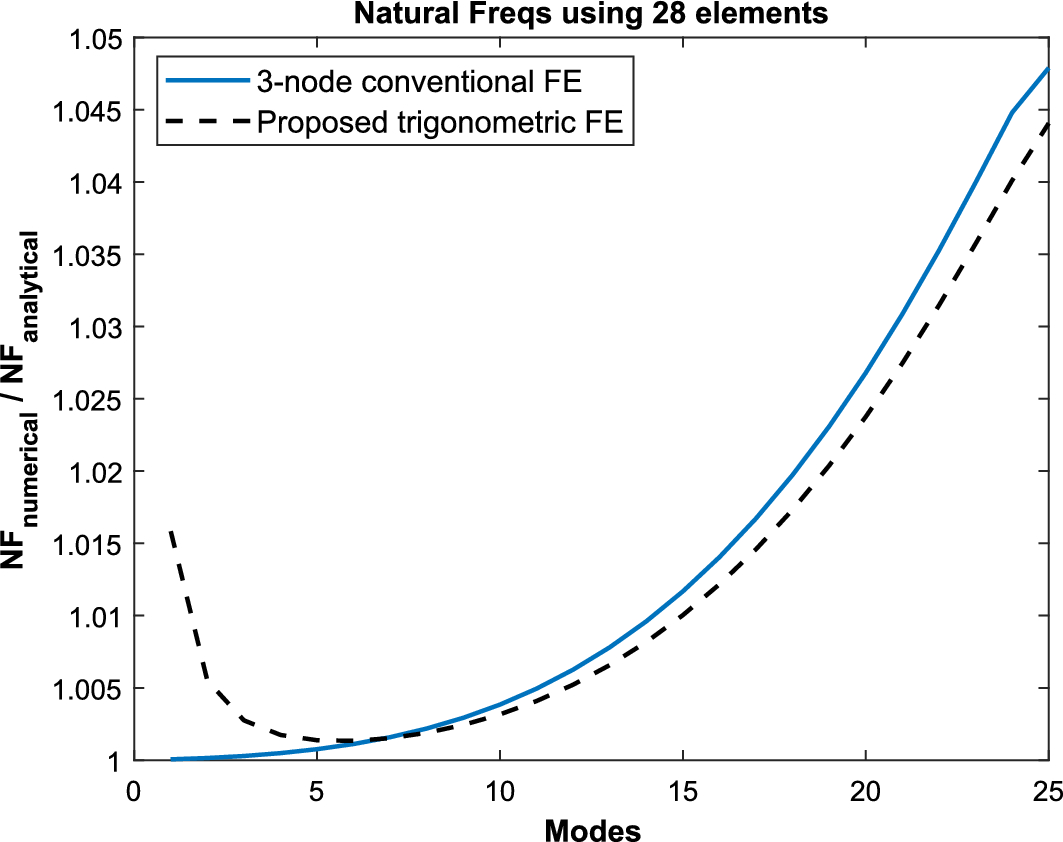 Similarly to the rod case, a clamped-pinned isotropic beam with geometric and material characteristics that are shown in Table 1 is considered for the modal analysis case study. The normalized ratios of numerical to analytical natural frequencies are plotted in Fig. 6 for the first 25 frequencies. The analytical solution for the natural frequencies is the one presented in the work of Chandrashekhara et al. [49]. Both the trigonometric and the conventional 3-node FE models utilize 28 elements. The analytical expression utilized to calculate the natural frequencies for a clamped-pinned beam from [49] is presented in Equation 15.