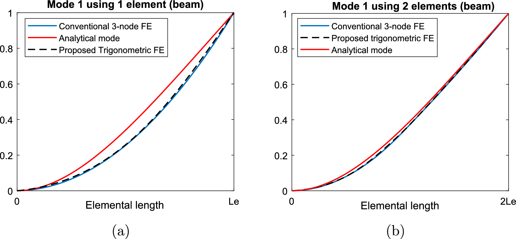 For the sake of completeness, the proposed method’s performance was also compared to the conventional 3-node FE in the estimation of the first eigenmode, using 1 and 2 elements. In Figure 3, the first mode is presented for both models and mesh cases and is compared to the analytical mode. The presented results seem to be close to each other, so the absolute errors with respect to the analytical mode are illustrated in order to observe which model is more accurate.