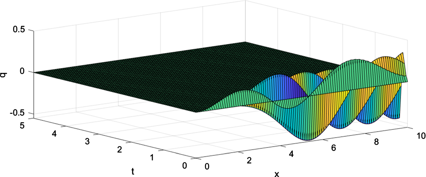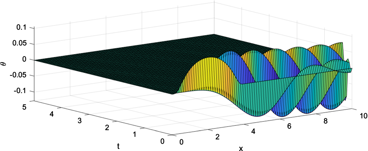 The 3D-plots in Figs. 13, 14, 15 and 16 show distributions of the unknown functions in space and time. In particular, the plot for the electric potential illustrates the oblique wave front in the (x, t)-plane to confirm the existence of the fast wave. This figure confirms that the electric potential follows the shape of the boundary temperature.