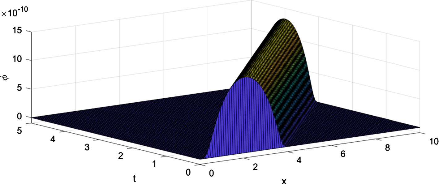 The 3D-plot in Fig. 8 shows the wave front and thus confirms the wave nature of the solution.