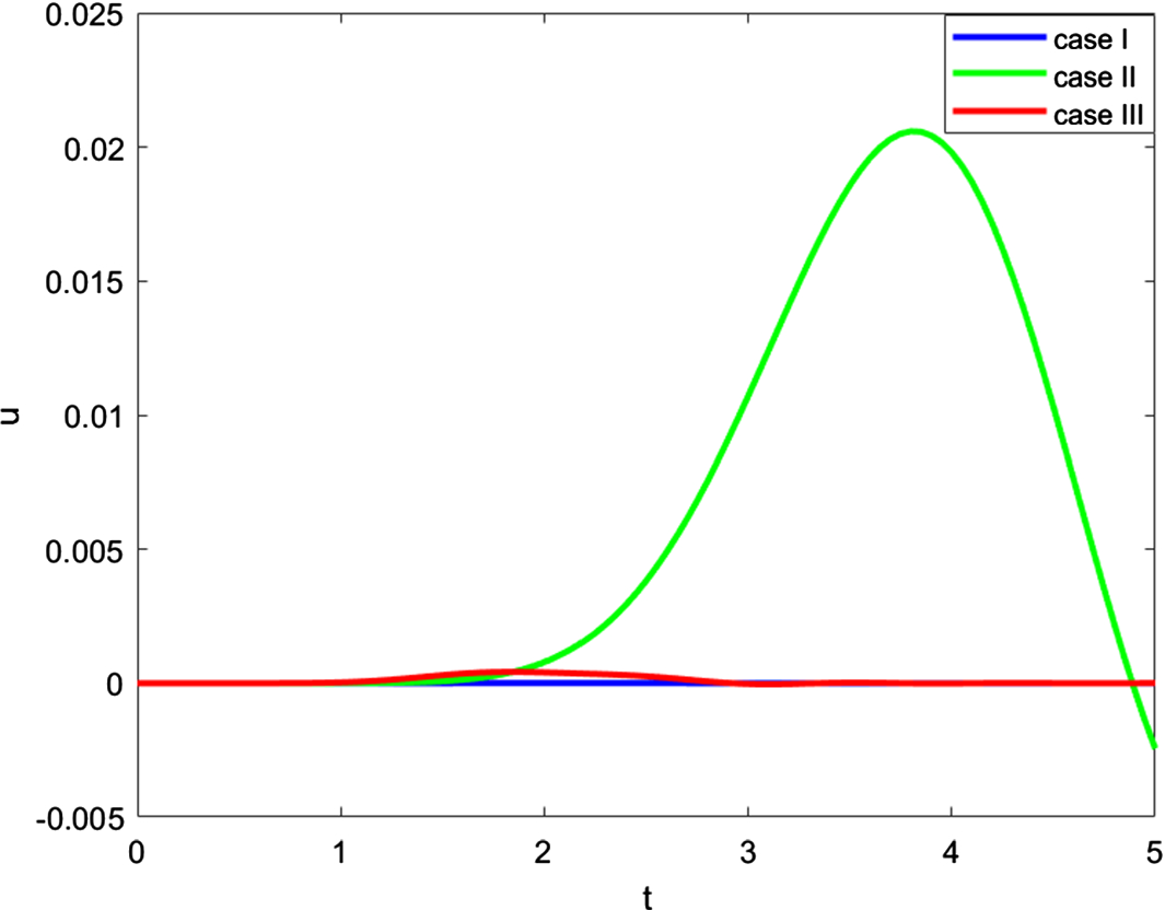 Comparison of distributions for displacement at location \(x=0.5\) as functions of time for three cases