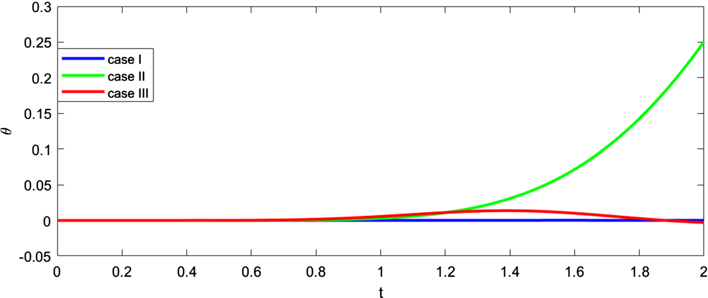 Case 1: The speed of the coupled thermoelastic wave in the linear theory is approximately equal to one third of that of the heat wave (\(v_e \simeq 0.37\)). Based on this value, the disturbance are expected to reach the location \(x=0.5\) at which the solution is evaluated approximately at time \(t =1.35\). The delay shown in the figures below concerning the displacement, temperature and heat flux will be somewhat different due to the fact that the speed is not exactly equal to \(v_e\) according to (27).