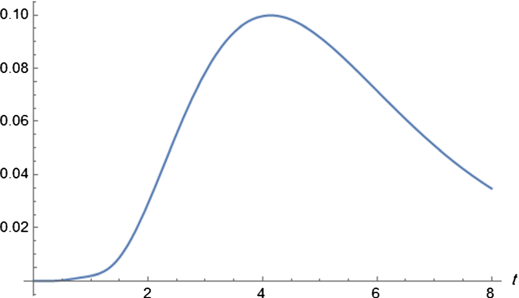 where we have shown the three-dimensional distribution of temperature in the half-space, and the temperature as function of time at the location \(x=1\). Notice the time lag needed for the heat wave to reach location \(x=1\), and that the wave amplitude at this location (\(\simeq 0.1\)) is smaller than the amplitude of the boundary regime (\(\simeq 0.134\)). Temperature is non-negative everywhere in compliance with the laws of thermodynamics as expected. As the heat flux is much smaller than temperature in absolute value, we have verified that the nonlinear solution for this boundary regime is almost identical to the linear one for the considered time values \(t \le 1\). Deviations between the two solutions may become more substantial as time grows.