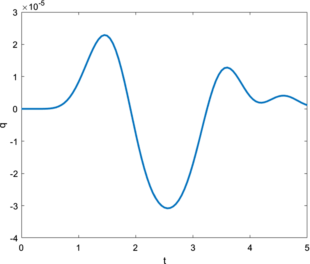 The Figs. 4, 5 and 6 for the displacement, temperature and heat flux show the slower, coupled thermoelastic wave propagating with speed \(v_E\), with oscillations about the zero that are damped in time. It is most probable that the effects of the fast wave here are much smaller and thus not noticeable.