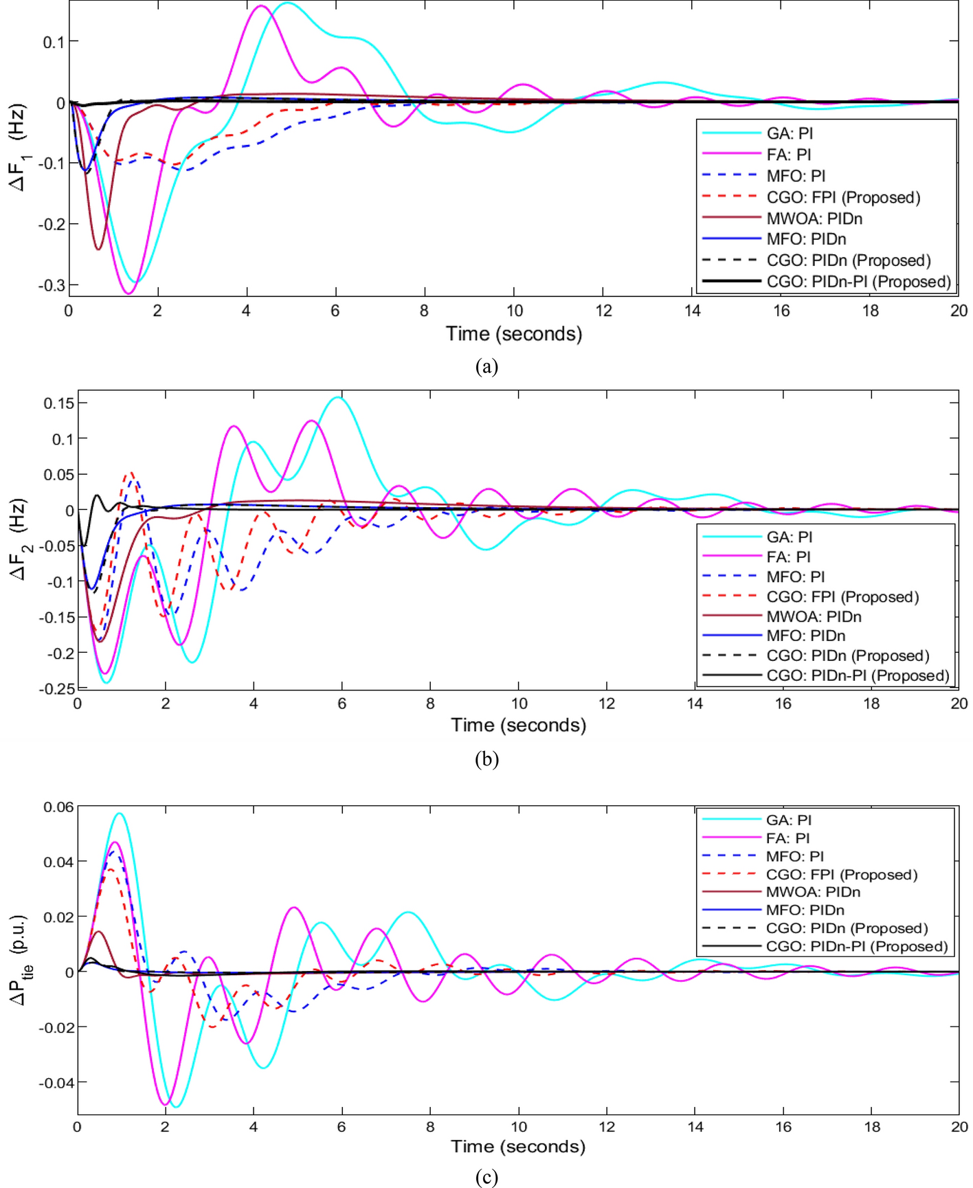 System responses for 10% SLP in area 2: a\(\Delta {F}_{1}\), b\(\Delta {F}_{2}\), and c\(\Delta {P}_{tie-line}\)