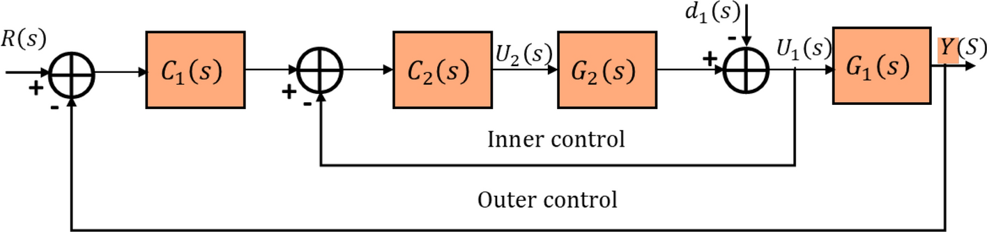The inner control loop includes the source process \(G\)2\(\left(s\right)\). The input of the outer control loop is the output of the inner control loop. \({U}_{2}\left(s\right)\) is the input of the inner control loop (Crowe 2005). The inner control loop equation can be expressed as