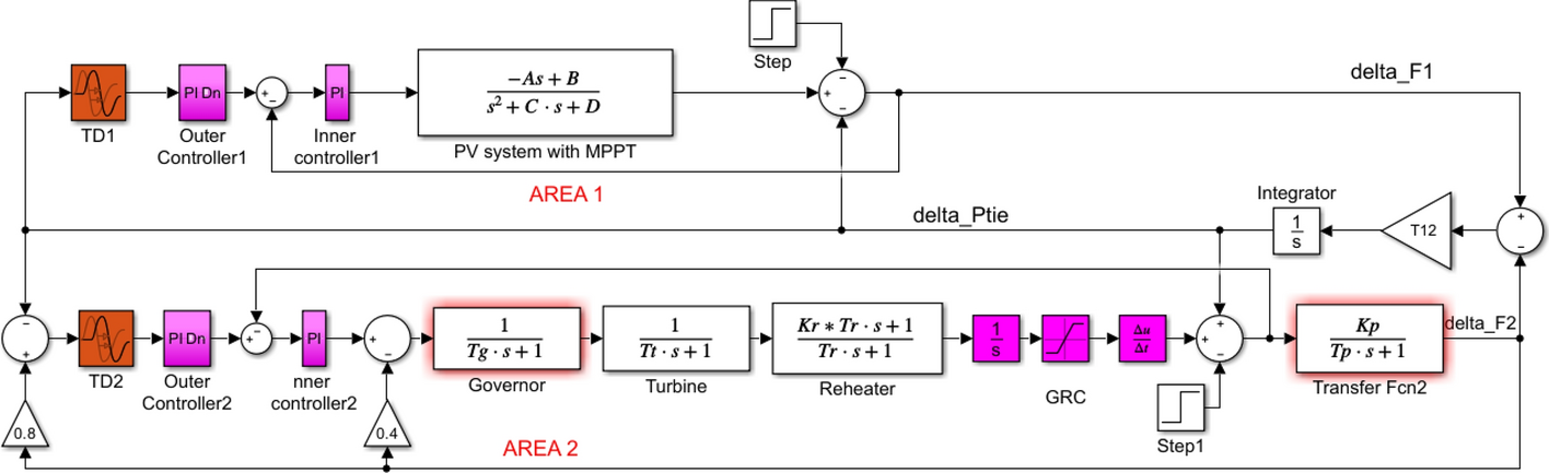 Simulink model for the two-area PV–reheat thermal IPS with a PI/PID single controller