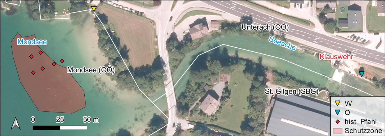 In Abb. 2 ist der östliche Bereich des Mondsees samt Wehr-Zulaufstrecke und Klauswehr im Detail dargestellt. Die beiden Wehrfelder des Klauswehrs werden in der gegenwärtigen Situation ausschließlich auf Basis des gemessenen Wasserstands (W) des Pegels See am Mondsee (HZBNR 205302; Standort in Abb. 2) gesteuert. Zum Aufnahmezeitpunkt des Orthofotos bestand eine NW-Situation, da nur eines von zwei Wehrfeldern überströmt wird. Gut veranschaulicht wird in Abb. 2 auch der sehr seichte Bereich stromauf der Brücke über die Seeache. Vor allem dieser Teilbereich wirkt als maßgebender hydraulischer „Flaschenhals“ in der Wehr-Zulaufstrecke. Die abgebildeten Pfähle in Abb. 2 (ohne Anspruch auf Vollständigkeit) sind Reste einer prähistorischen Pfahlbausiedlung (ca. 3800–3500 v. Chr.) aus der Jungsteinzeit (PAL 2023) und gehören zum UNESCO-Welterbe – deshalb wurde vom Bundesdenkmalamt (BDA) eine Schutzzone eingerichtet (roter Bereich in Abb. 2). Die Pfahlreste sind zum überwiegenden Teil von einer schützenden Sedimentschicht überdeckt, welche erhalten bleiben sollte. Die Seeache bildet zum Teil die Grenze zwischen den österreichischen Bundesländern Oberösterreich (OÖ) und Salzburg (SBG).