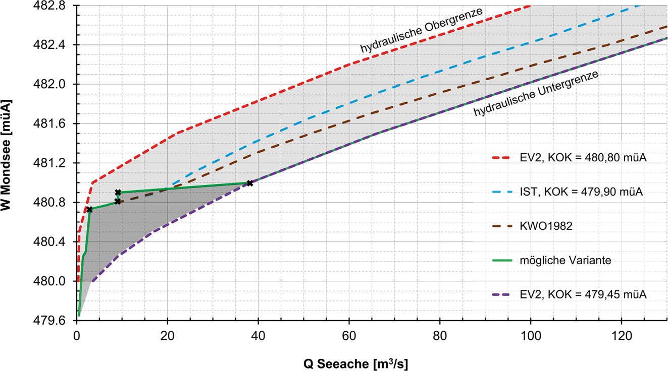 Als Ergänzung zur multikriteriellen Optimierung der KWO (Abschn. 3.3) wird auch eine Variante dargestellt, welche nur hinsichtlich eines Kriteriums – der maximalen Reduzierung von extremen Wasserständen im Mondsee – optimiert wurde. Dies ist jene Variante, bei der (1) die hydraulische Kapazität der Wehr-Zulaufstrecke z. B. durch Ausbaggerung erhöht wird, sowie (2) die Wehrklappen bei jedem geringfügigen Anstieg des Wasserspiegels des Mondsees sehr schnell voll umgelegt werden. Voll umgelegte Wehrklappen werden in diesem Fall ab einem Wasserstand des Mondsees von 480,80 m ü. A.5 festgelegt („KWO.hw“ in Abb. 4).