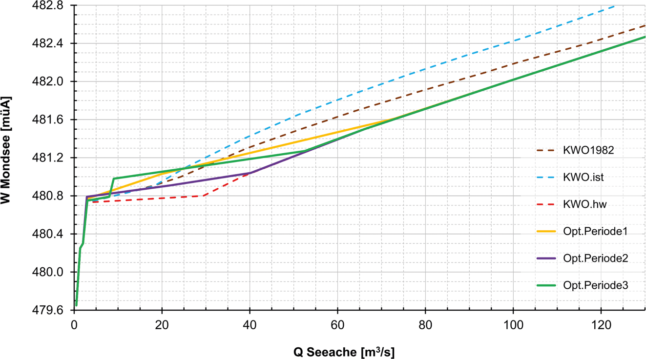 Als Abflussfunktion des Mondsees wurden für den Zeitraum vorerst die behördlich bewilligte KWO1982 und die im Vorprojekt ermittelte KWO.ist verwendet. Mit beiden KWO konnten hohe Modellgüten (NSE3 > 0,9; Nash und Sutcliffe 1970) erreicht werden.4 Mit KWO.ist wurde beim HW 2013 mit 482,21 m ü. A. exakt jener Wasserstand modelliert, welcher auf Tagesbasis auch beobachtet wurde. Der mittlere Abfluss des Mondsees liegt sowohl mit KWO1982 als auch mit KWO.ist (und auch bei allen folgenden Optimierungsvarianten) bei 8,7 m3/s, während die Beobachtung einen Wert von 9,1 m3/s aufweist. Diese Differenz von 0,4 m3/s entspricht einer relativen Abweichung von ca. 4 % und kann mit den tendenziell zu großen Abflusswerten des Pegels begründet werden (Habersack et al. 2018). Daher werden als Referenz (in weiterer Folge als „REF“ bezeichnet) für die folgenden Optimierungsvarianten der KWO nicht die Messwerte der W‑ bzw. Q‑Pegel See am Mondsee, sondern der Modellierungslauf mit KWO1982 verwendet. Durch diese Maßnahme kann auch ausgeschlossen werden, dass Unsicherheiten in den Eingangsdaten (E-, N‑, Q‑Zeitreihen) eine verzerrende Einwirkung auf die Wahl der besten Optimierungsvariante haben, da diese Unsicherheiten dann sowohl in REF als auch in den modellierten Optimierungsvarianten ident sind und der einzige Unterschied die zugrunde gelegte KWO ist.